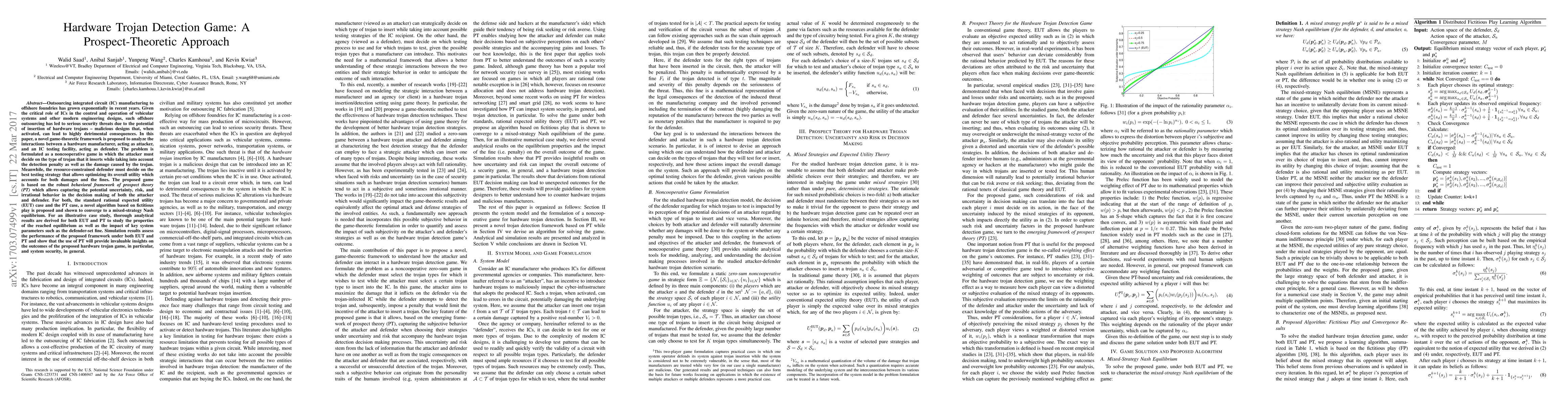 This paper proposes a novel game-theoretic framework based on prospect theory to analyze the interactions between a hardware manufacturer (attacker) and an IC testing facility (defender) in detecting hardware trojans. The framework captures the uncertainty and irrational behaviors in decision-making, contrasting with the standard rational expected utility theory, and demonstrates its effectiveness through a fictitious play algorithm converging to a mixed-strategy Nash equilibrium.