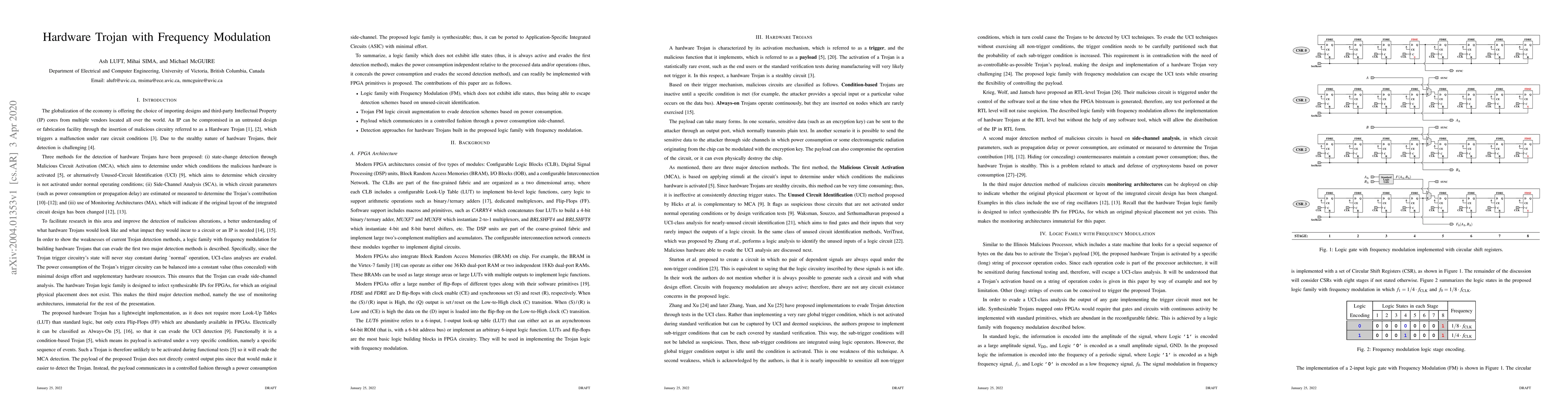 This paper introduces a novel logic family for implementing robust hardware Trojans in FPGAs that evade detection by encoding information in frequency rather than amplitude, making them undetectable through unused-circuit identification and side-channel analysis. It also discusses defense measures against such frequency-modulated Trojans.