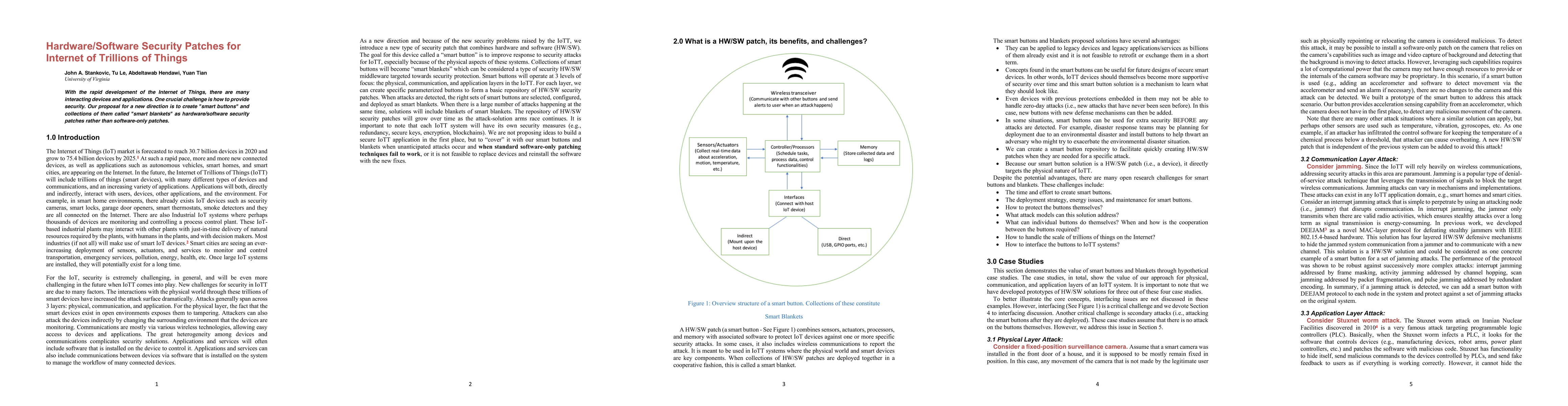 With the rapid development of the Internet of Things, there are many interacting devices and applications. One crucial challenge is how to provide security. Our proposal for a new direction is to create "smart buttons" and collections of them called "smart blankets" as hardware/software security patches rather than software-only patches.