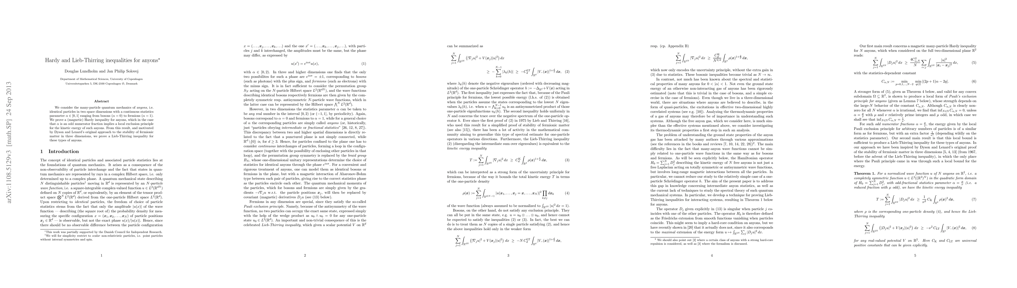 This paper proves the Hardy and Lieb-Thirring inequalities for anyons, particles with continuous statistics between bosons and fermions. The Hardy inequality implies a local exclusion principle for the kinetic energy of anyons when the statistics parameter is an odd numerator fraction. The Lieb-Thirring inequality is also established for these anyons, extending Dyson and Lenard's approach to stability in three dimensions.