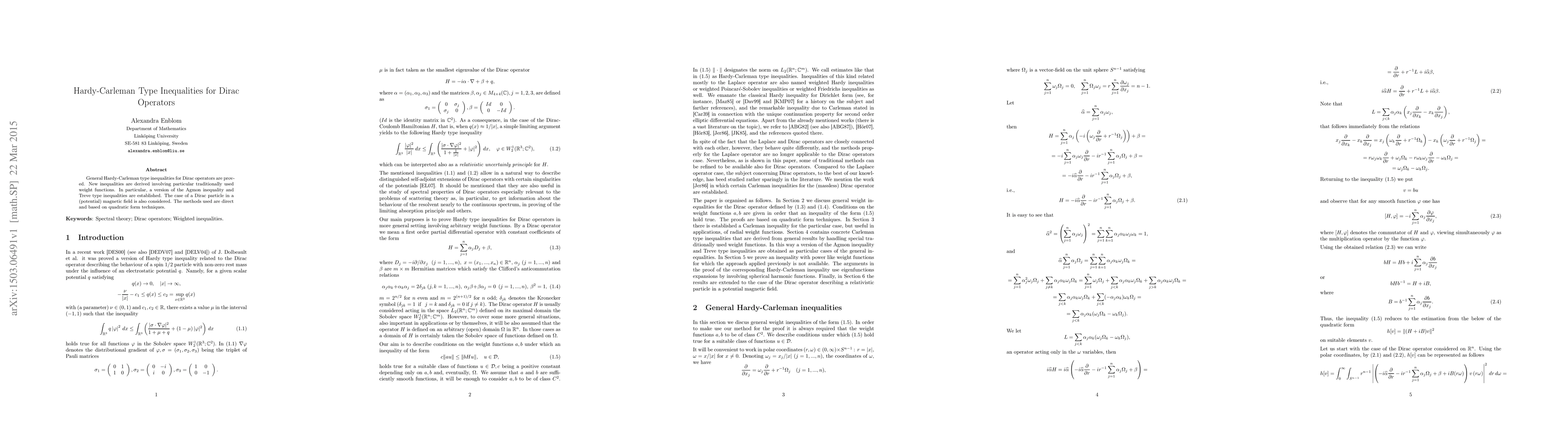 This paper proves new Hardy-Carleman type inequalities for Dirac operators, including Agmon and Treve type inequalities, using quadratic form techniques. It also examines the case of a Dirac particle in a magnetic field.