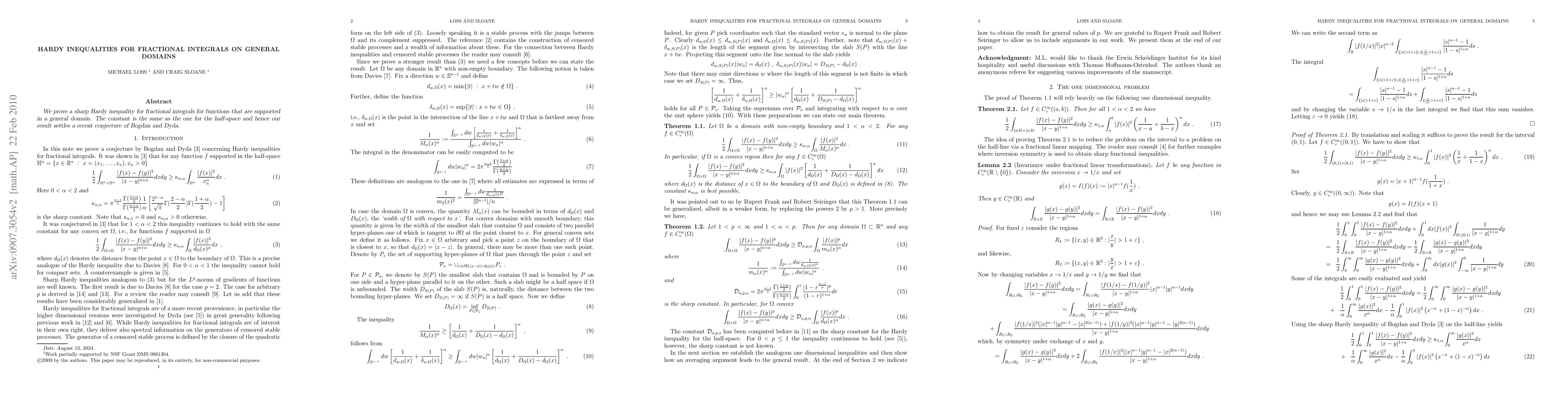 This paper presents a sharp Hardy inequality for fractional integrals applicable to functions supported on any domain, confirming a previous conjecture about the constant's constancy, similar to that in the half-space.