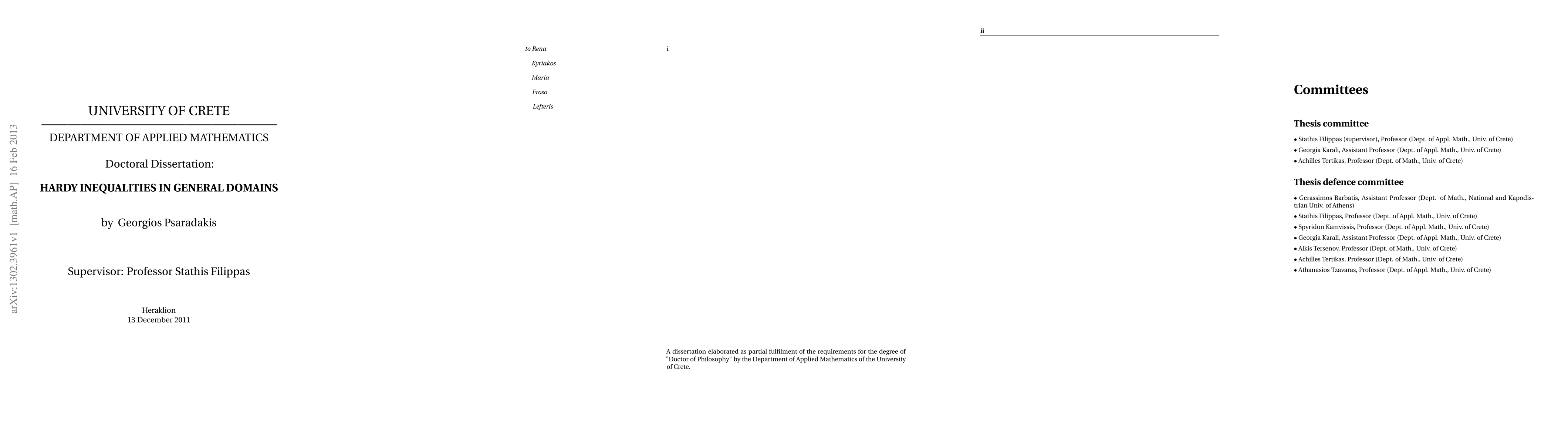 Key Words: Hardy inequalities, Sobolev inequalities, Morrey inequality, distance function, mean curvature, best constants, semi-concavity, sets with positive reach, mean convex sets, Cheeger constant, modulus of continuity