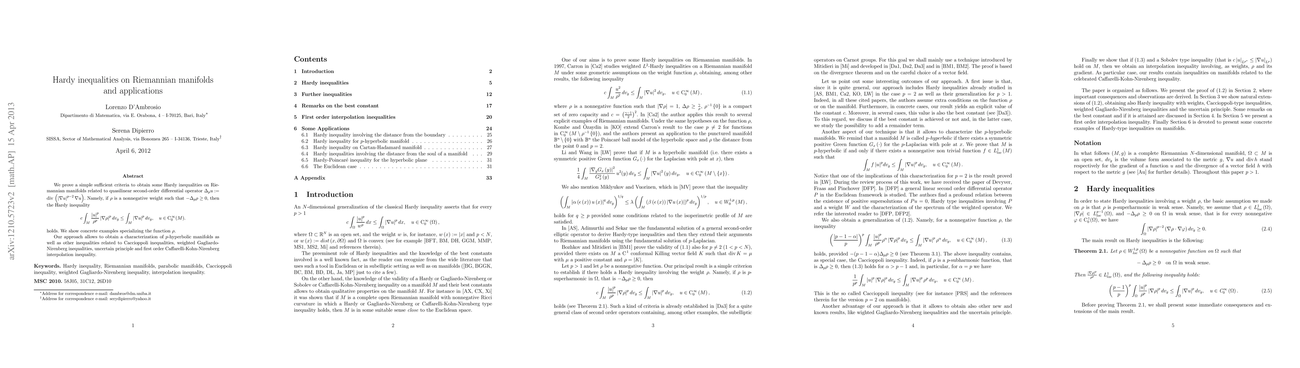 This paper provides a sufficient criterion for deriving Hardy inequalities on Riemannian manifolds using quasilinear second-order differential operators. It demonstrates the inequality under specific nonnegative weight functions and showcases practical examples.