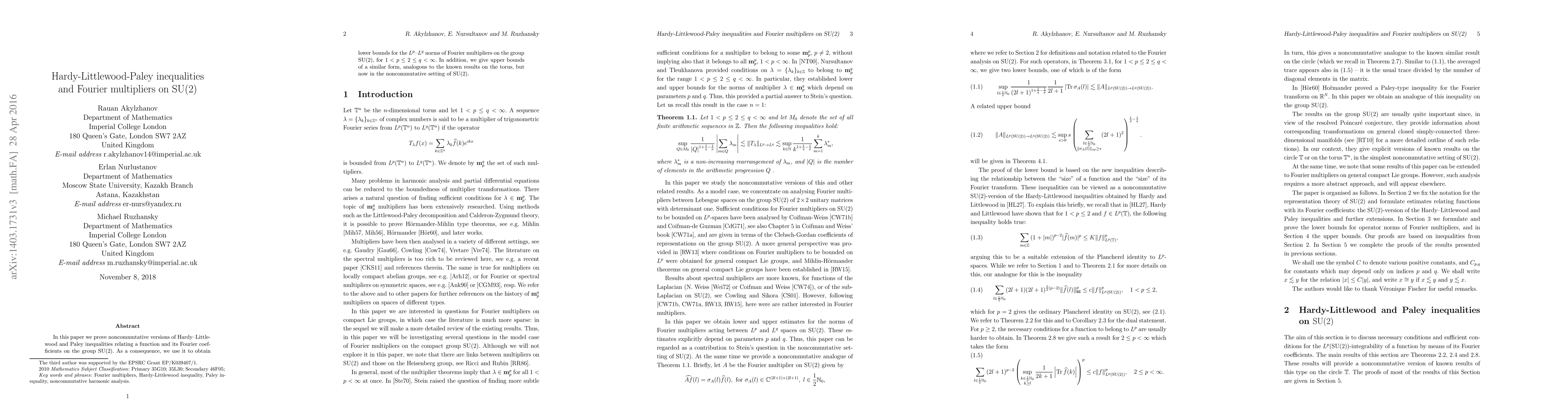 In this paper we prove a noncommutative version of Hardy-Littlewood inequalities relating a function and its Fourier coefficients on the group $SU(2)$. As a consequence, we use it to obtain lower bounds for the $L^p-L^q$ norms of Fourier multipliers on the group $SU(2)$, for $1 < p \leq 2 \leq q < 1$. In addition, we give upper bounds of a similar form, analogous to the known results on the torus, but now in the noncommutative setting of $SU(2)$.