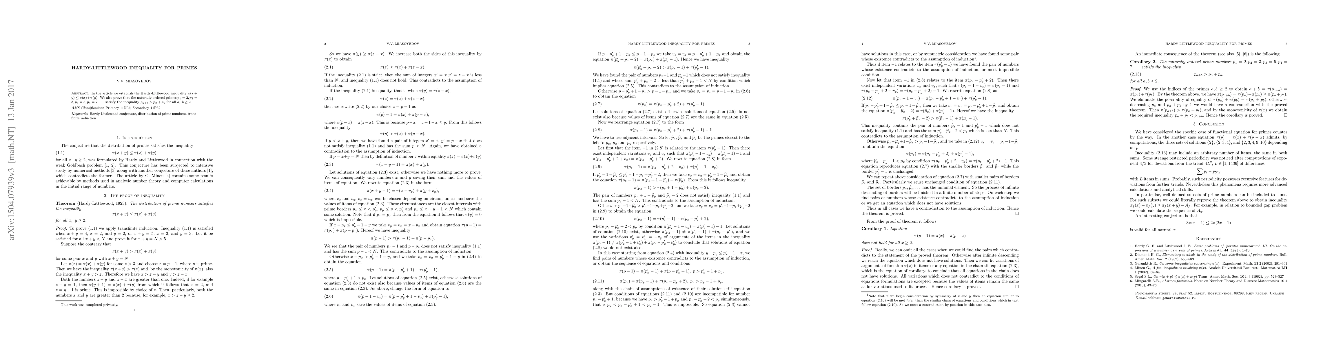 The paper establishes the Hardy-Littlewood inequality $\pi (x + y) \leq \pi (x) + \pi (y)$ and proves that for all $a, b \geq 2$, the primes satisfy $p_{a + b} > p_a + p_b$.