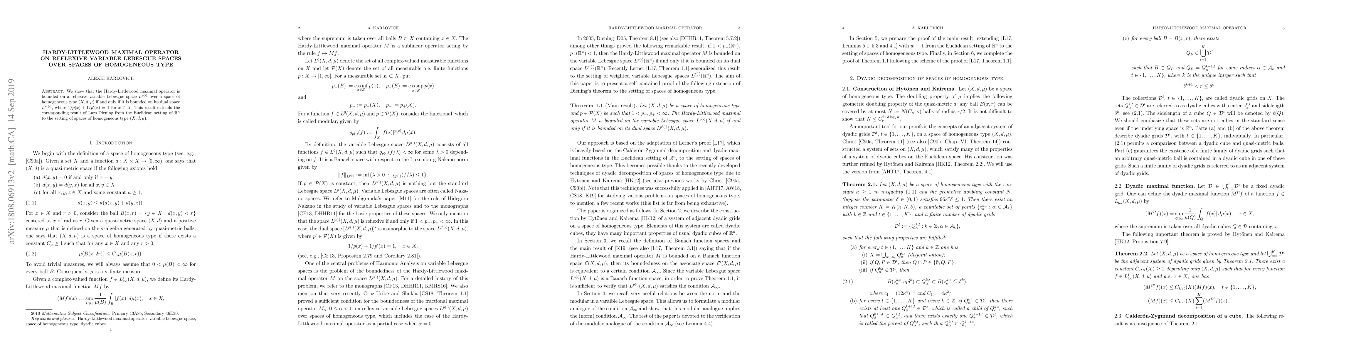 Summary: The paper demonstrates that the Hardy-Littlewood maximal operator is bounded on reflexive variable Lebesgue spaces $L^{p(\cdot)}$ over spaces of homogeneous type if and only if it is bounded on their dual spaces $L^{p'(\cdot)}$. This extends Lars Diening's result from $\mathbb{R}^n$ to more general spaces of homogeneous type.