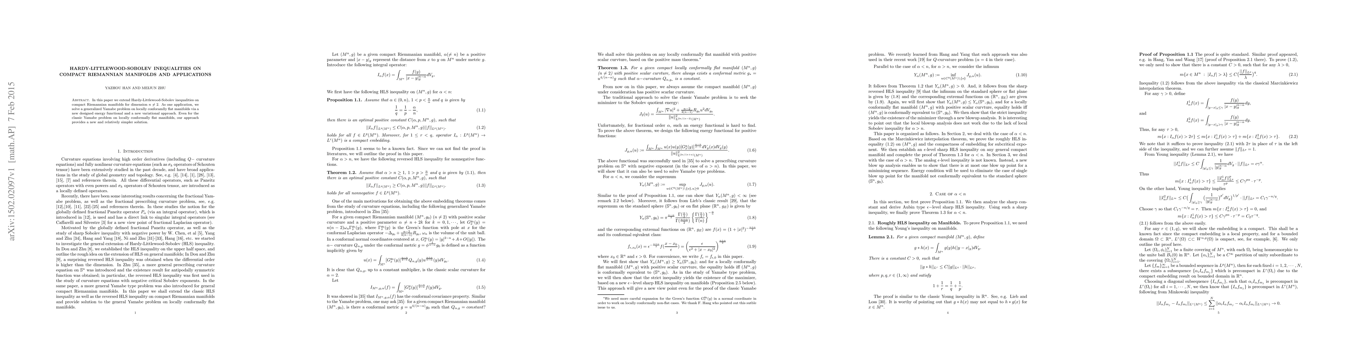 This paper extends Hardy-Littlewood-Sobolev inequalities to compact Riemannian manifolds for dimensions other than two. It applies these inequalities to solve a generalized Yamabe problem on locally conformally flat manifolds using a novel energy functional and variational approach.