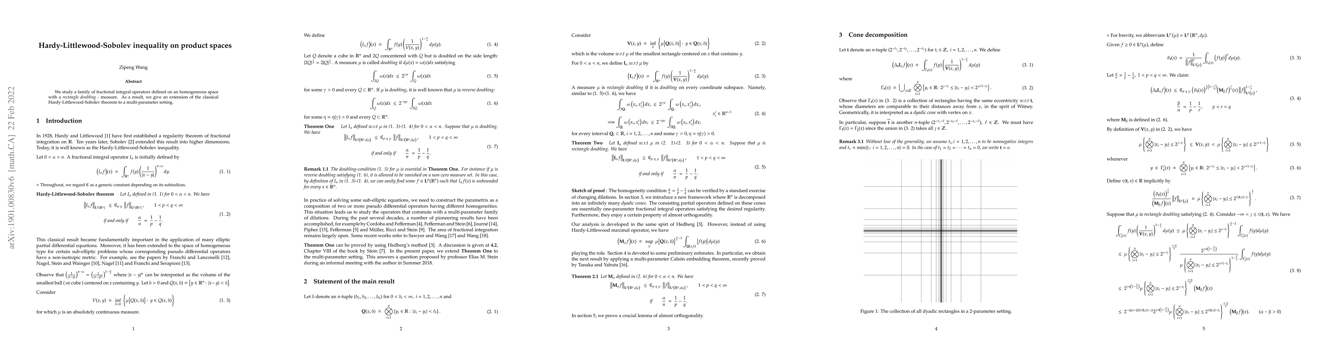 The paper extends the Hardy-Littlewood-Sobolev theorem to a multi-parameter setting on product spaces using fractional integral operators with a 'rectangle doubling' measure.