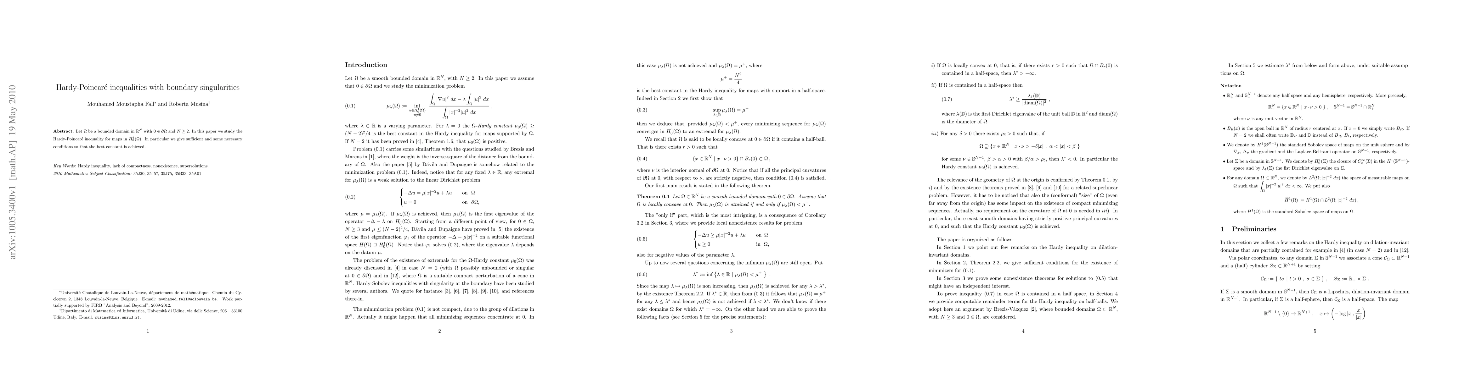 This paper investigates conditions under which the Hardy-Poincaré inequality for functions in $H^1_0(Omega)$, a space of Sobolev functions, is achieved, specifically within bounded domains $O$ in $R^N$ (with $Nge 2$) that include the origin and have boundary singularities. It provides both necessary and sufficient conditions for constant attainment.