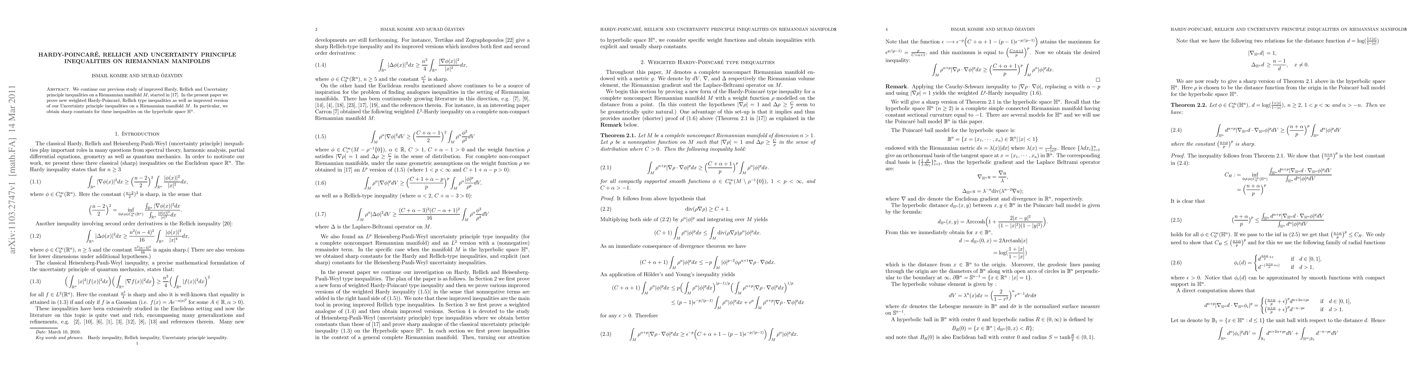 We continue our previous study of improved Hardy, Rellich and Uncertainty principle inequalities on a Riemannian manifold $M$, started in \cite{Kombe-Ozaydin}. In the present paper we prove new weighted Hardy-Poincar\'e, Rellich type inequalities as well as improved version of our Uncertainty principle inequalities on a Riemannian manifold $M$. In particular, we obtain sharp constants for these inequalities on the hyperbolic space $\mathbb{H}^n$.