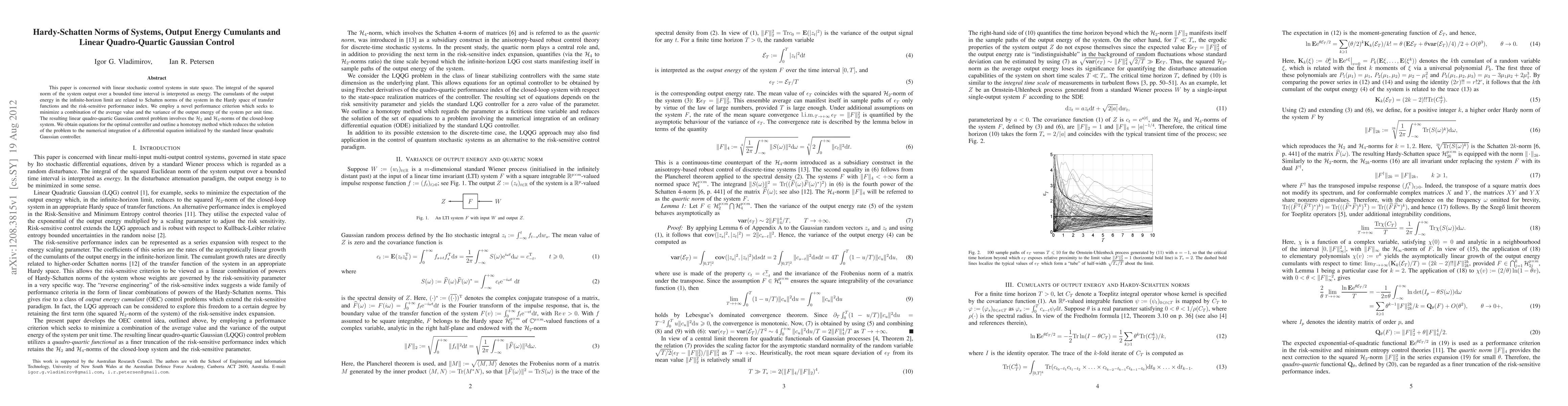 This paper is concerned with linear stochastic control systems in state space. The integral of the squared norm of the system output over a bounded time interval is interpreted as energy. The cumulants of the output energy in the infinite-horizon limit are related to Schatten norms of the system in the Hardy space of transfer functions and the risk-sensitive performance index. We employ a novel performance criterion which seeks to minimize a combination of the average value and the variance of the output energy of the system per unit time. The resulting linear quadro-quartic Gaussian control problem involves the H2 and H4-norms of the closed-loop system. We obtain equations for the optimal controller and outline a homotopy method which reduces the solution of the problem to the numerical integration of a differential equation initialized by the standard linear quadratic Gaussian controller.