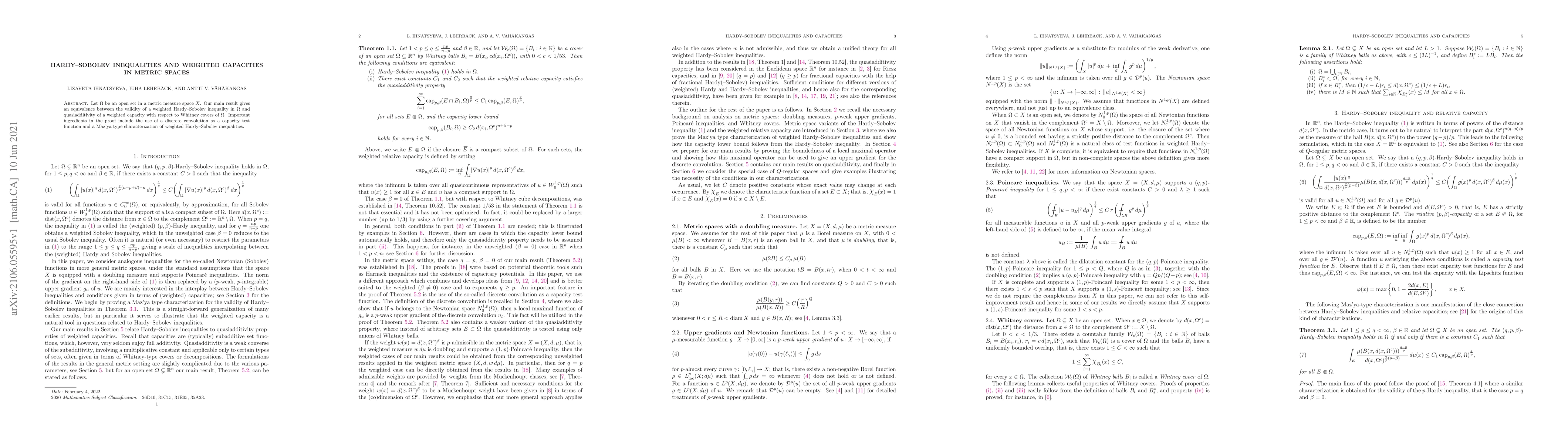 Let $\Omega$ be an open set in a metric measure space $X$. Our main result gives an equivalence between the validity of a weighted Hardy-Sobolev inequality in $\Omega$ and quasiadditivity of a weighted capacity with respect to Whitney covers of $\Omega$. Important ingredients in the proof include the use of a discrete convolution as a capacity test function and a Maz'ya type characterization of weighted Hardy-Sobolev inequalities.