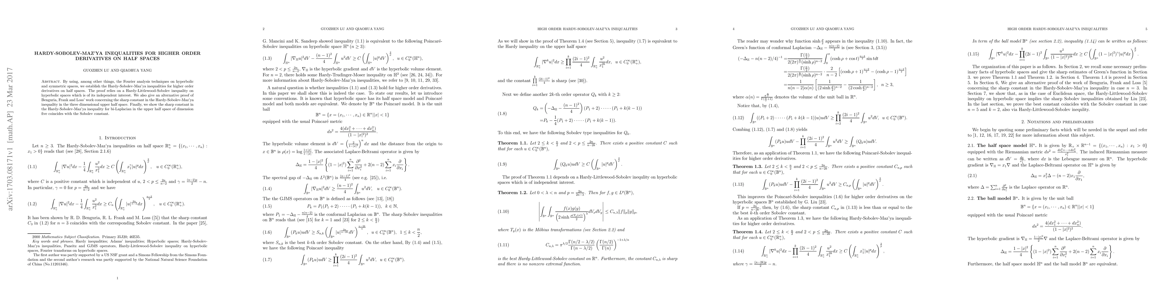 By using, among other things, the Fourier analysis techniques on hyperbolic and symmetric spaces, we establish the Hardy-Sobolev-Maz'ya inequalities for higher order derivatives on half spaces. The proof relies on a Hardy-Littlewood-Sobolev inequality on hyperbolic spaces which is of its independent interest. We also give an alternative proof of Benguria, Frank and Loss' work concerning the sharp constant in the Hardy-Sobolev-Maz'ya inequality in the three dimensional upper half space. Finally, we show the sharp constant in the Hardy-Sobolev-Maz'ya inequality for bi-Laplacian in the upper half space of dimension five coincides with the Sobolev constant.