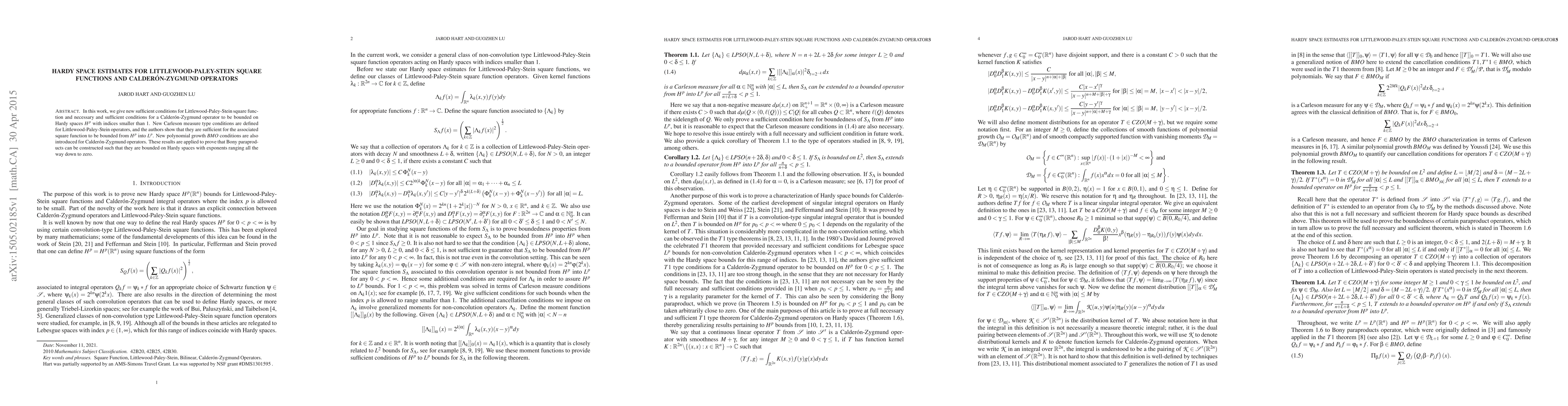 This paper establishes new sufficient conditions for Littlewood-Paley-Stein square functions and Calderón-Zygmund operators to be bounded on Hardy spaces $H^p$ with $p<1$. It introduces Carleson measure type conditions for the former and polynomial growth $BMO$ conditions for the latter, and applies these to show Bony paraproducts can be bounded on Hardy spaces down to $H^0$.