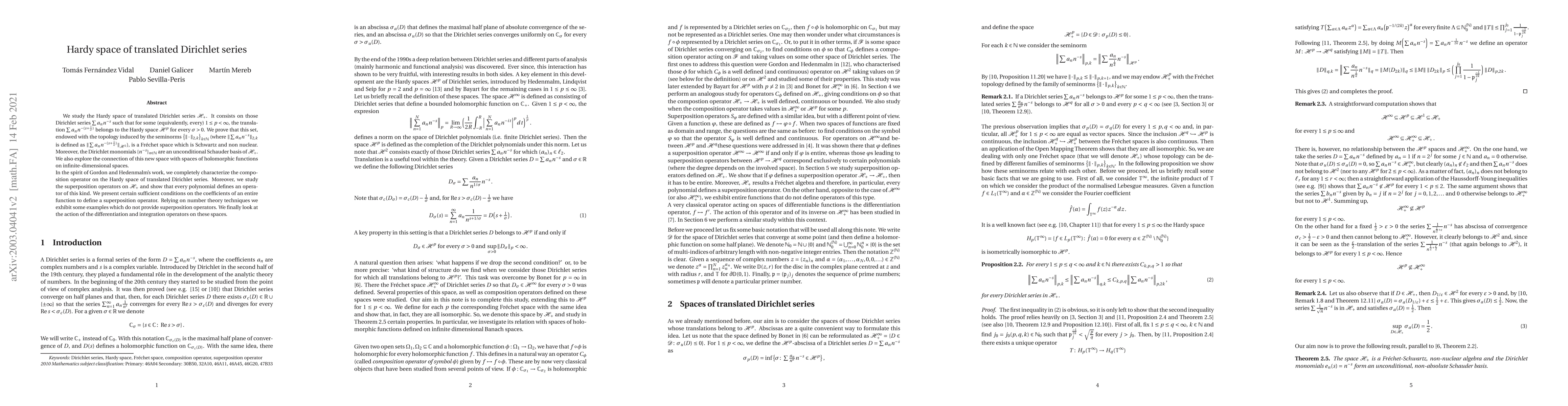 We study the Hardy space of translated Dirichlet series $\mathcal{H}_{+}$. It consists on those Dirichlet series $\sum a_n n^{-s}$ such that for some (equivalently, every) $1 \leq p < \infty$, the translation $\sum{a_{n}}n^{-(s+\frac{1}{\sigma})}$ belongs to the Hardy space $\mathcal{H}^{p}$ for every $\sigma>0$. We prove that this set, endowed with the topology induced by the seminorms $\left\{\Vert\cdot\Vert_{2,k}\right\}_{k\in\mathbb{N}}$ (where $\Vert\sum{a_{n}n^{-s}}\Vert_{2,k}$ is defined as $\big\Vert\sum{a_n n^{-(s+\frac{1}{k})}} \big\Vert_{\mathcal{H}^{2}}$), is a Fr\'echet space which is Schwartz and non nuclear. Moreover, the Dirichlet monomials $\{n^{-s}\}_{n \in \mathbb N}$ are an unconditional Schauder basis of $\mathcal H_+$. In the spirit of Gordon and Hedenmalm's work, we completely characterize the composition operator on the Hardy space of translated Dirichlet series. Moreover, we study the superposition operators on $\mathcal{H}_{+}$ and show that every polynomial defines an operator of this kind. We present certain sufficient conditions on the coefficients of an entire function to define a superposition operator. Relying on number theory techniques we exhibit some examples which do not provide superposition operators. We finally look at the action of the differentiation and integration operators on these spaces.