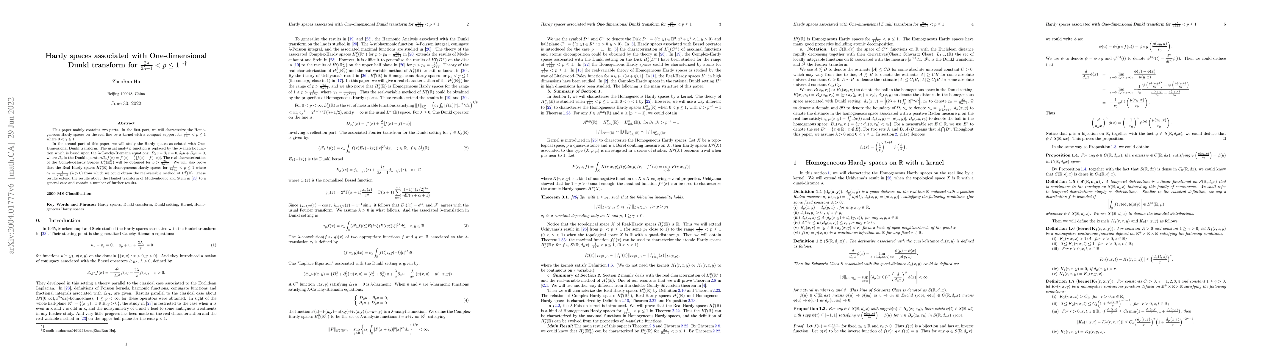 Summary: This paper investigates Hardy spaces linked to the one-dimensional Dunkl transform for the range \( \frac{2\lambda}{2\lambda+1} < p \leq 1 \) using real methods. The focus is on the Dunkl setting on the real line for \( 0 < p \leq 1 \).