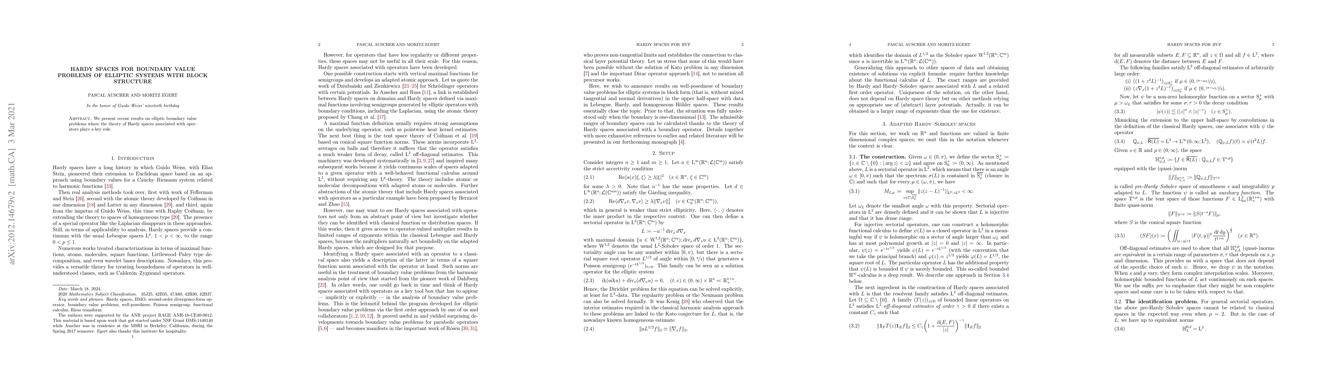 Summary: This paper explores elliptic boundary value problems using Hardy spaces, focusing on the role of these spaces in addressing the complexities of elliptic systems with block structure. Recent theoretical advancements are presented to enhance the understanding of these mathematical frameworks.