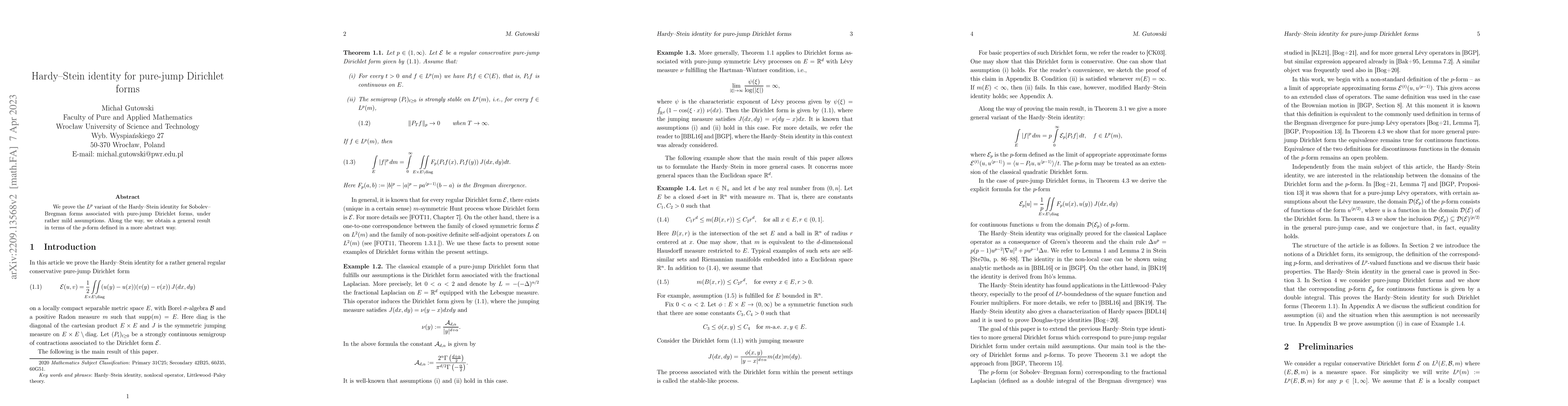 Summary: This paper proves the $L^p$ variant of the Hardy-Stein identity for pure-jump Dirichlet forms, establishing a general result for Sobolev-Bregman forms under mild assumptions. The findings extend the identity to a more abstract $p$-form context.