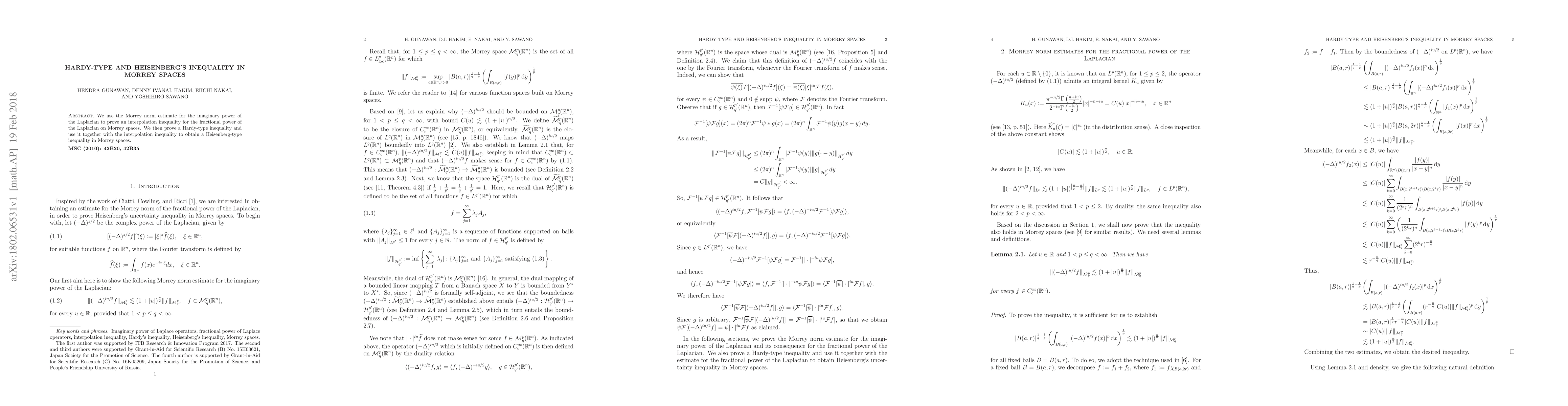 We use the Morrey norm estimate for the imaginary power of the Laplacian to prove an interpolation inequality for the fractional power of the Laplacian on Morrey spaces. We then prove a Hardy-type inequality and use it together with the interpolation inequality to obtain a Heisenberg-type inequality in Morrey spaces.