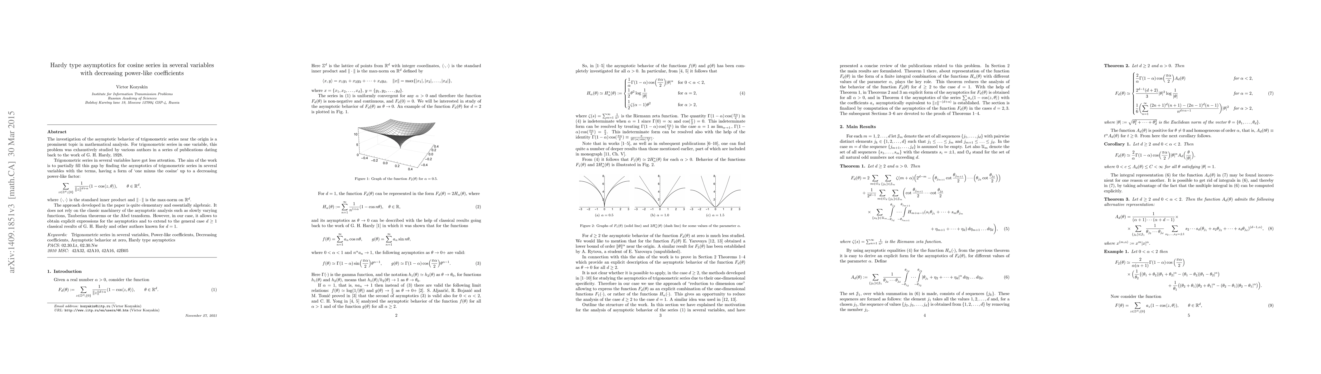 This paper investigates the asymptotic behavior of cosine series in several variables with decreasing power-like coefficients, focusing on the series \[\sum_{z\in\mathbb{Z}^{d}\setminus\{0\}}\frac{1}{\|z\|^{d+\alpha}}\left(1-\cos\langle z,\theta\rangle\right)\]. The study employs an elementary algebraic approach to derive explicit asymptotic expressions, extending classical results from one-variable to higher dimensions.