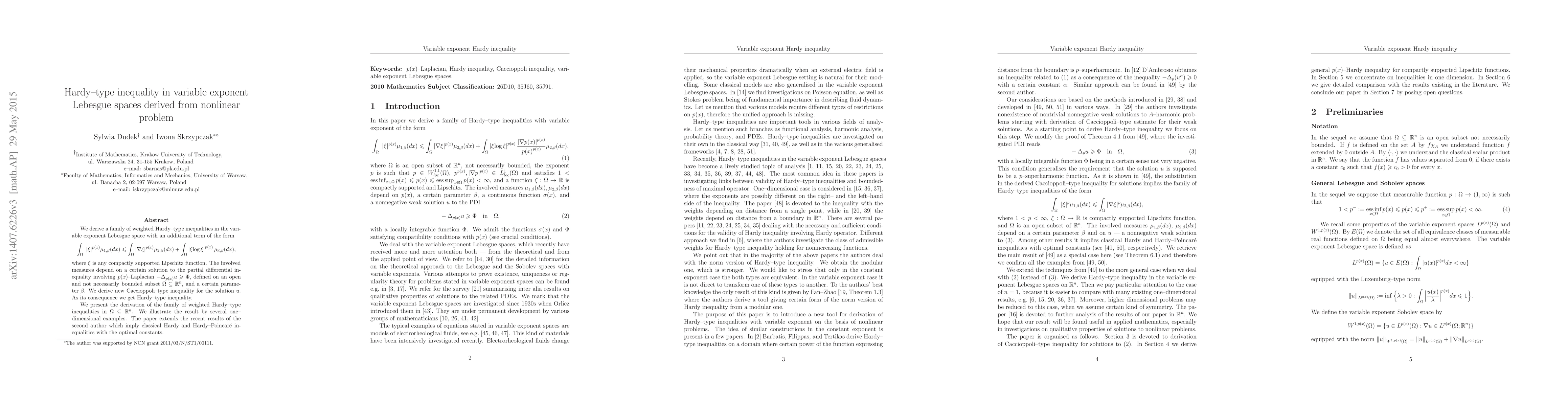 We derive a family of weighted Hardy-type inequalities in the variable exponent Lebesgue space with an additional term of the form \[ \int_\Omega\ |\xi|^{p(x)} \mu_{1,\beta}(dx)\leqslant \int_\Omega |\nabla \xi|^{p(x)}\mu_{2,\beta}(dx)+\int_\Omega \left|\xi{\log \xi} \right|^{p(x)} \mu_{3,\beta}(dx), \] where $\xi$ is any compactly supported Lipschitz function. The involved measures depend on a certain solution to the partial differential inequality involving $p(x)$-Laplacian ${-}\Delta_{p(x)} u\geqslant \Phi$, where $\Phi$ is a given locally integrable function, and $u$ is defined on an open and not necessarily bounded subset $\Omega\subseteq\mathbb{R}^n $, and a certain parameter $\beta$. We derive new Caccioppoli-type inequality for the solution $u$. As its consequence we get Hardy-type inequality. We illustrate the result by several one-dimensional examples.