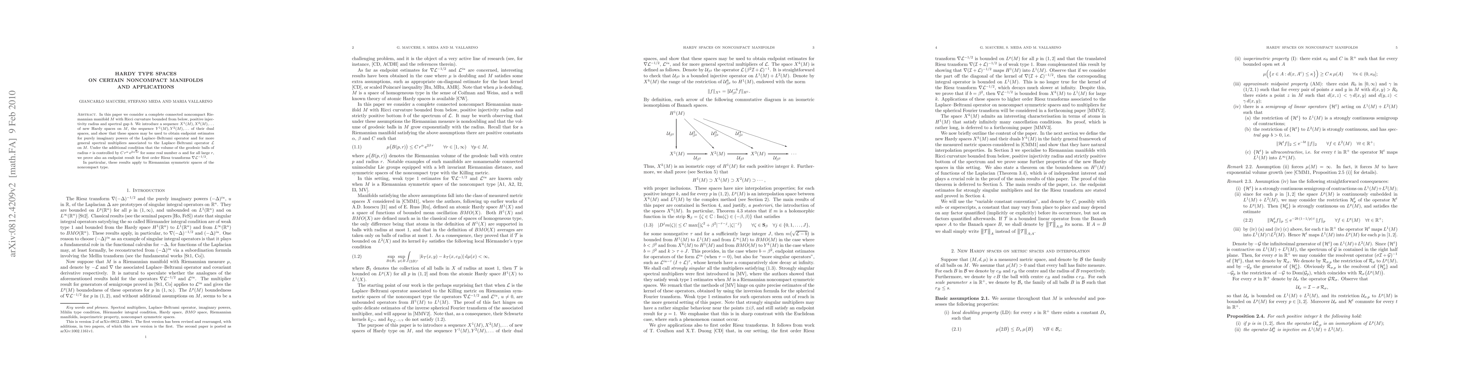In this paper we consider a complete connected noncompact Riemannian manifold M with Ricci curvature bounded from below, positive injectivity radius and spectral gap b. We introduce a sequence X^1(M), X^2(M), ... of new Hardy spaces on M, the sequence Y^1(M/, Y^2(M), ... of their dual spaces, and show that these spaces may be used to obtain endpoint estimates for purely imaginary powers of the Laplace-Beltrami operator and for more general spectral multipliers associated to the Laplace--Beltrami operator L on M. Under the additional condition that the volume of the geodesic balls of radius r is controlled by C r^a e^{2\sqrt{b} r} for some real number a and for all large r, we prove also an endpoint result for first order Riesz transforms D L^{-1/2}. In particular, these results apply to Riemannian symmetric spaces of the noncompact type.