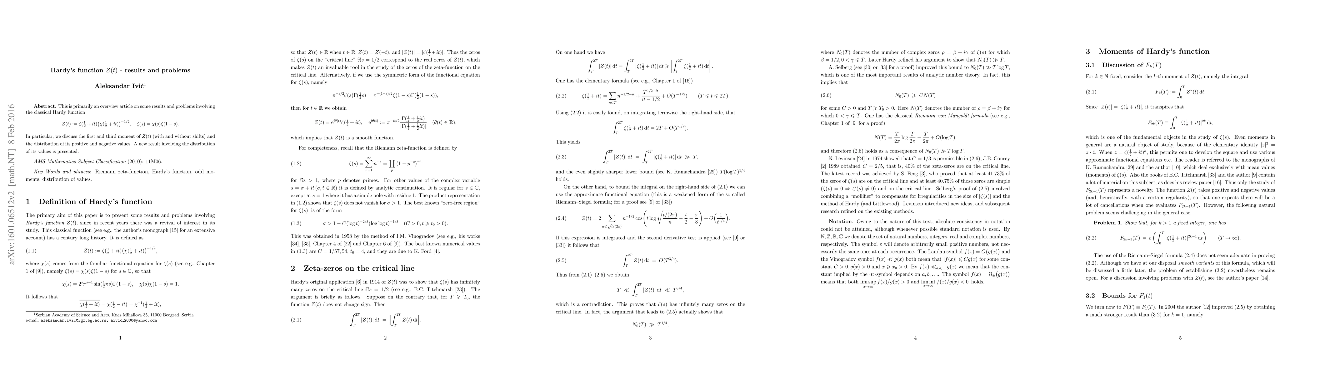 This is primarily an overview article on some results and problems involving the classical Hardy function $$ Z(t) := \zeta(1/2+it){\bigl(\chi(1/2+it)\bigr)}^{-1/2}, \quad \zeta(s) = \chi(s)\zeta(1-s). $$ In particular, we discuss the first and third moment of $Z(t)$ (with and without shifts) and the distribution of its positive and negative values. A new result involving the distribution of its values is presented.