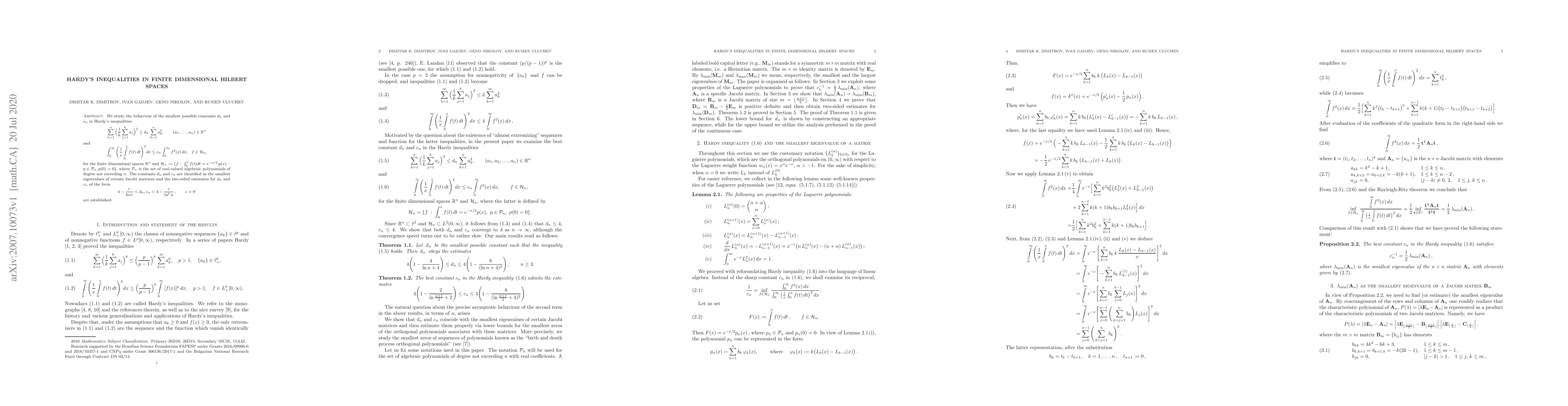 We study the behaviour of the smallest possible constants $d_n$ and $c_n$ in Hardy's inequalities $$ \sum_{k=1}^{n}\Big(\frac{1}{k}\sum_{j=1}^{k}a_j\Big)^2\leq d_n\,\sum_{k=1}^{n}a_k^2, \qquad (a_1,\ldots,a_n) \in \mathbb{R}^n $$ and $$ \int_{0}^{\infty}\Bigg(\frac{1}{x}\int\limits_{0}^{x}f(t)\,dt\Bigg)^2 dx \leq c_n \int_{0}^{\infty} f^2(x)\,dx, \ \ f\in \mathcal{H}_n, $$ for the finite dimensional spaces $\mathbb{R}^n$ and $\mathcal{H}_n:=\{f\,:\, \int_0^x f(t) dt =e^{-x/2}\,p(x)\ :\ p\in \mathcal{P}_n, p(0)=0\}$, where $\mathcal{P}_n$ is the set of real-valued algebraic polynomials of degree not exceeding $n$. The constants $d_n$ and $c_n$ are identified as the smallest eigenvalues of certain Jacobi matrices and the two-sided estimates for $d_n$ and $c_n$ of the form $$ 4-\frac{c}{\ln n}< d_n, c_n<4-\frac{c}{\ln^2 n}\,,\qquad c>0\, $$ are established.