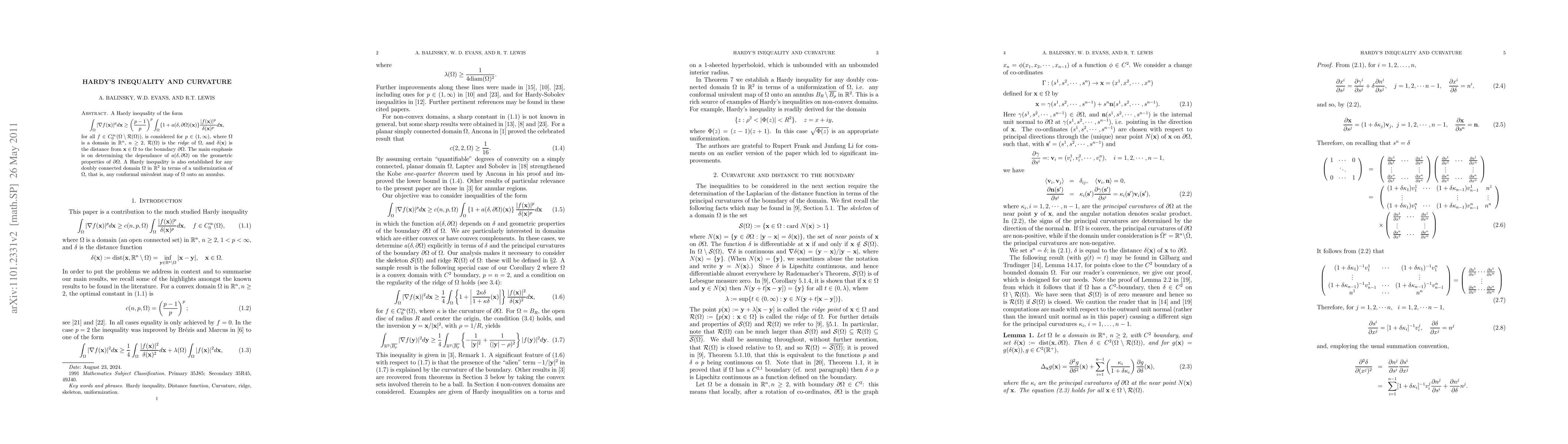 A Hardy inequality of the form \[\int_{\tilde{\Omega}} |\nabla f({\bf{x}})|^p d {\bf{x}} \ge (\frac{p-1}{p})^p \int_{\tilde{\Omega}} \{1 + a(\delta, \partial \tilde{\Omega})(\x)\}\frac{|f({\bf{x}})|^p}{\delta({\bf{x}})^p} d{\bf{x}}, \] for all $f \in C_0^{\infty}({\tilde{\Omega}})$, is considered for $p\in (1,\infty)$, where ${\tilde{\Omega}}$ can be either $\Omega$ or $\mathbb{R}^n \setminus \Omega$ with $\Omega$ a domain in $\mathbb{R}^n$, $n \ge 2$, and $\delta({\bf{x}})$ is the distance from ${\bf{x}} \in {\tilde{\Omega}} $ to the boundary $ \partial {\tilde{\Omega}}.$ The main emphasis is on determining the dependance of $a(\delta, \partial {\tilde{\Omega}})$ on the geometric properties of $\partial {\tilde{\Omega}}.$ A Hardy inequality is also established for any doubly connected domain $\Omega$ in $\mathbb{R}^2$ in terms of a uniformisation of $\Omega,$ that is, any conformal univalent map of $\Omega$ onto an annulus.