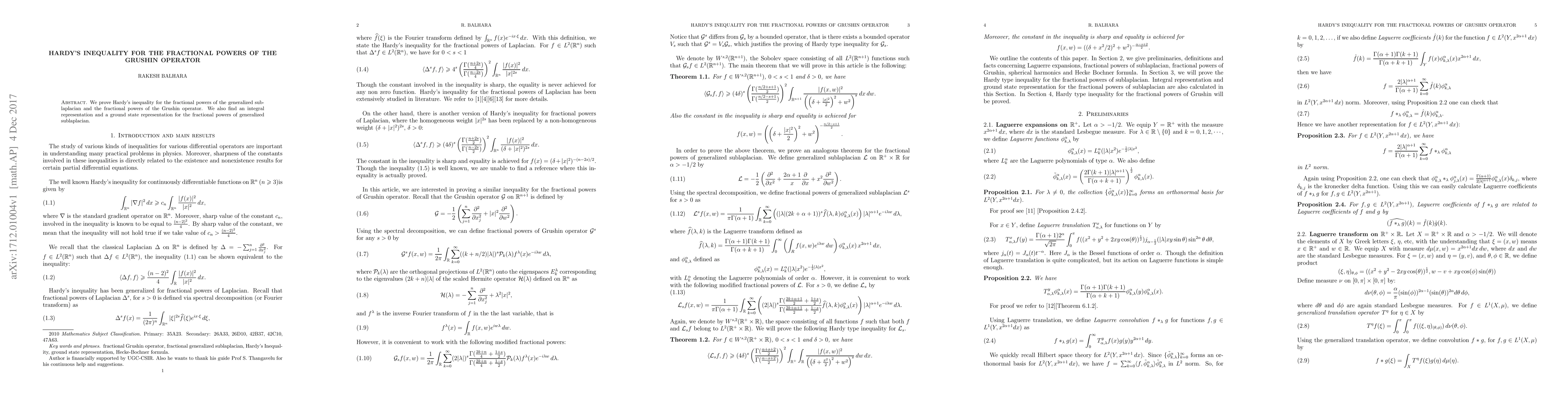 This research proves Hardy's inequality for fractional powers of the Grushin operator and the generalized sublaplacian, and also derives an integral and ground state representation for the former.