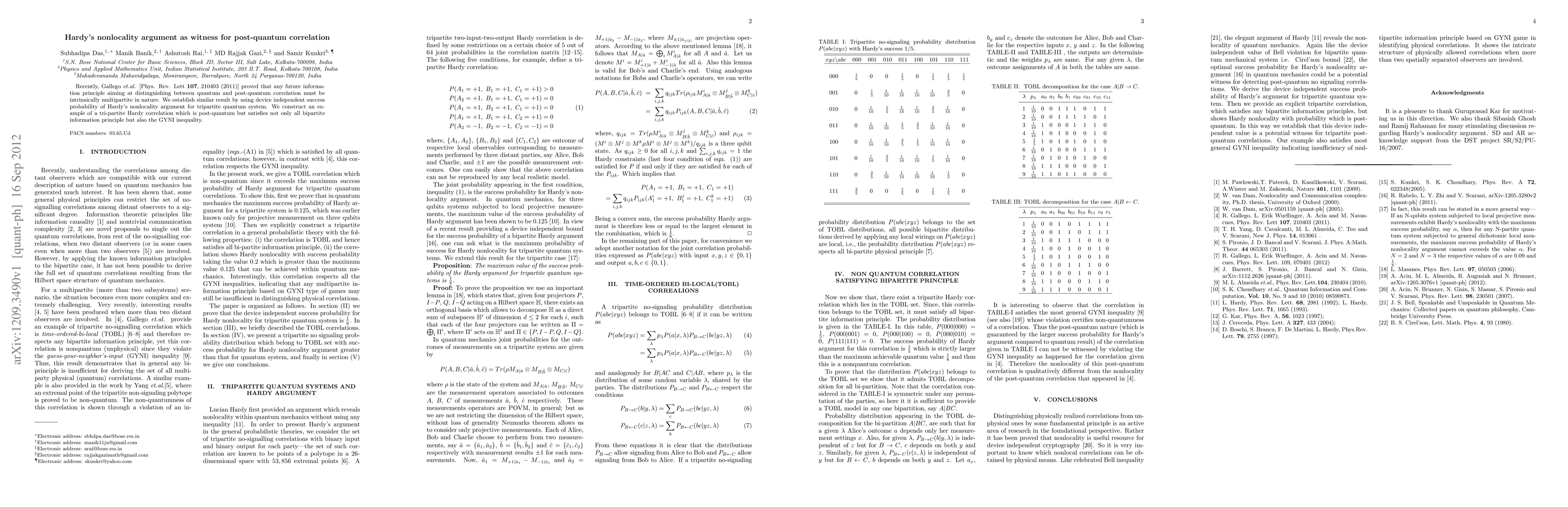 This paper demonstrates that Hardy's nonlocality argument can distinguish post-quantum correlations from quantum ones, showing that such distinctions require a multipartite framework. The authors construct a tri-partite example of Hardy correlations that exceed quantum limits yet comply with bipartite information principles and the GYNI inequality.