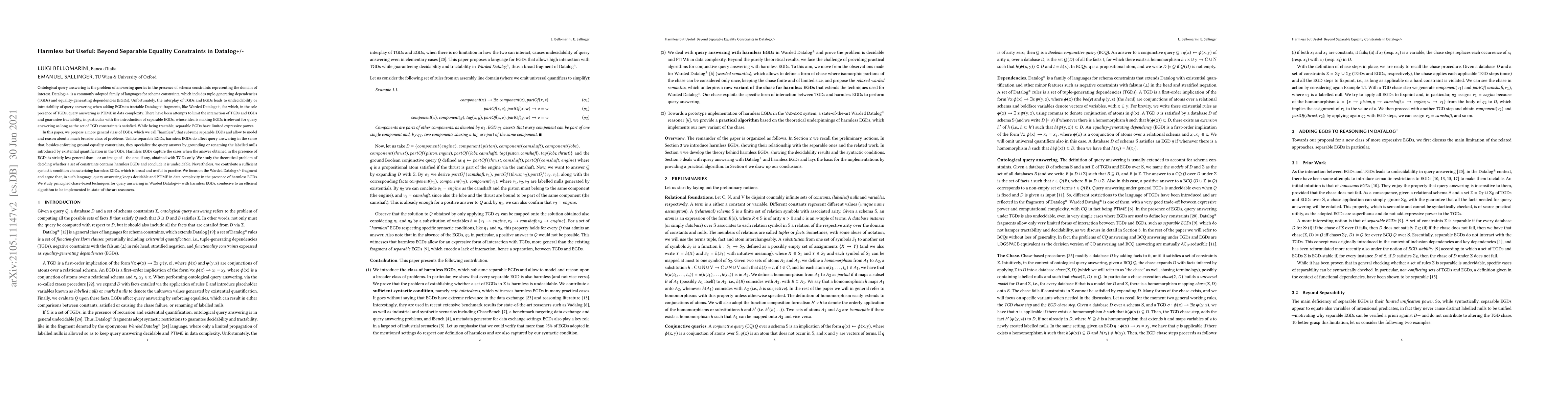This paper proposes "harmless" equality-generating dependencies (EGDs) to extend the expressive power beyond separable EGDs in Datalog+/-. It argues that these harmless EGDs can specialize query answers while maintaining PTIME data complexity for query answering in Warded Datalog+/-, offering practical chase-based techniques for implementation.