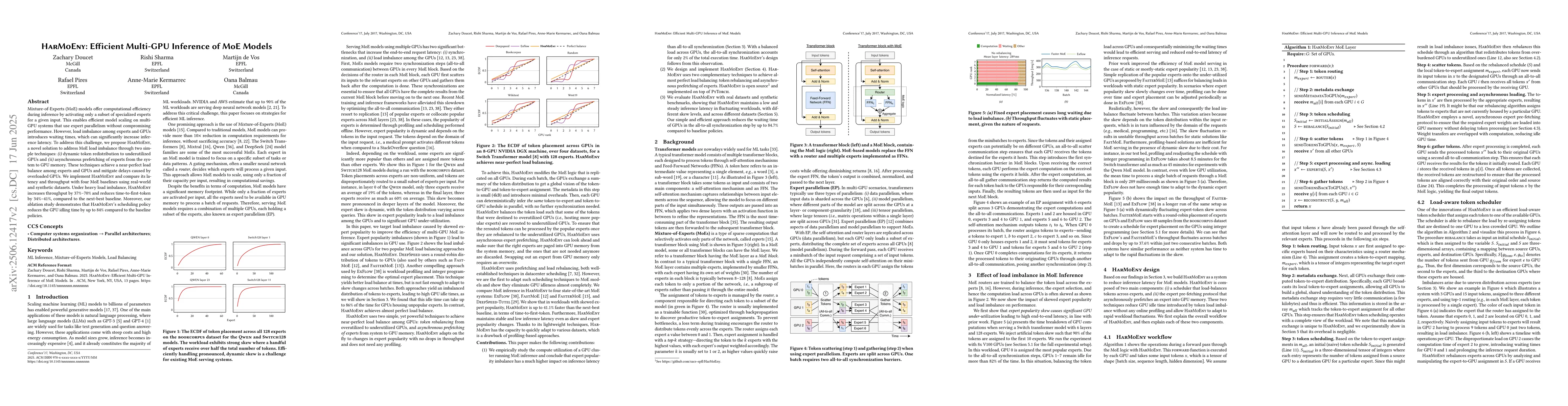 Mixture-of-Experts (MoE) models offer computational efficiency during inference by activating only a subset of specialized experts for a given input. This enables efficient model scaling on multi-GPU systems that use expert parallelism without compromising performance. However, load imbalance among experts and GPUs introduces waiting times, which can significantly increase inference latency. To address this challenge, we propose HarMoEny, a novel solution to address MoE load imbalance through two simple techniques: (i) dynamic token redistribution to underutilized GPUs and (ii) asynchronous prefetching of experts from the system to GPU memory. These techniques achieve a near-perfect load balance among experts and GPUs and mitigate delays caused by overloaded GPUs. We implement HarMoEny and compare its latency and throughput with four MoE baselines using real-world and synthetic datasets. Under heavy load imbalance, HarMoEny increases throughput by 37%-70% and reduces time-to-first-token by 34%-41%, compared to the next-best baseline. Moreover, our ablation study demonstrates that HarMoEny's scheduling policy reduces the GPU idling time by up to 84% compared to the baseline policies.