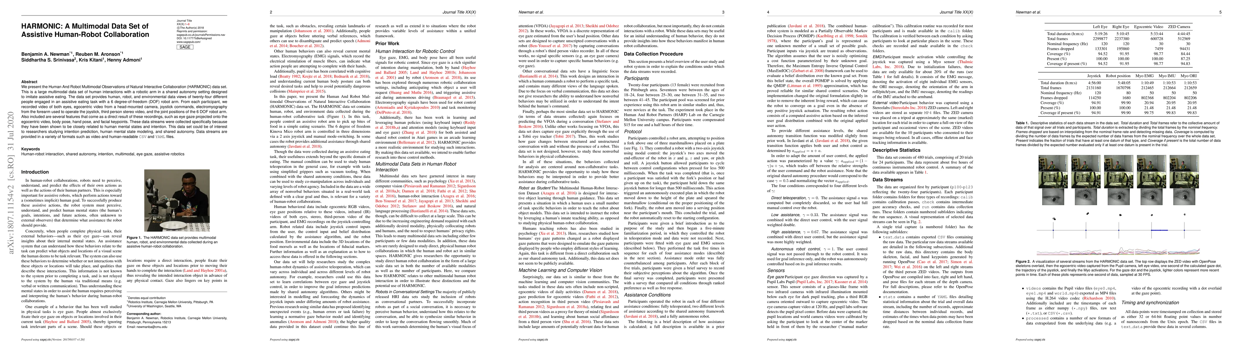 We present the Human And Robot Multimodal Observations of Natural Interactive Collaboration (HARMONIC) data set. This is a large multimodal data set of human interactions with a robotic arm in a shared autonomy setting designed to imitate assistive eating. The data set provides human, robot, and environmental data views of twenty-four different people engaged in an assistive eating task with a 6 degree-of-freedom (DOF) robot arm. From each participant, we recorded video of both eyes, egocentric video from a head-mounted camera, joystick commands, electromyography from the forearm used to operate the joystick, third person stereo video, and the joint positions of the 6 DOF robot arm. Also included are several features that come as a direct result of these recordings, such as eye gaze projected onto the egocentric video, body pose, hand pose, and facial keypoints. These data streams were collected specifically because they have been shown to be closely related to human mental states and intention. This data set could be of interest to researchers studying intention prediction, human mental state modeling, and shared autonomy. Data streams are provided in a variety of formats such as video and human-readable CSV and YAML files.