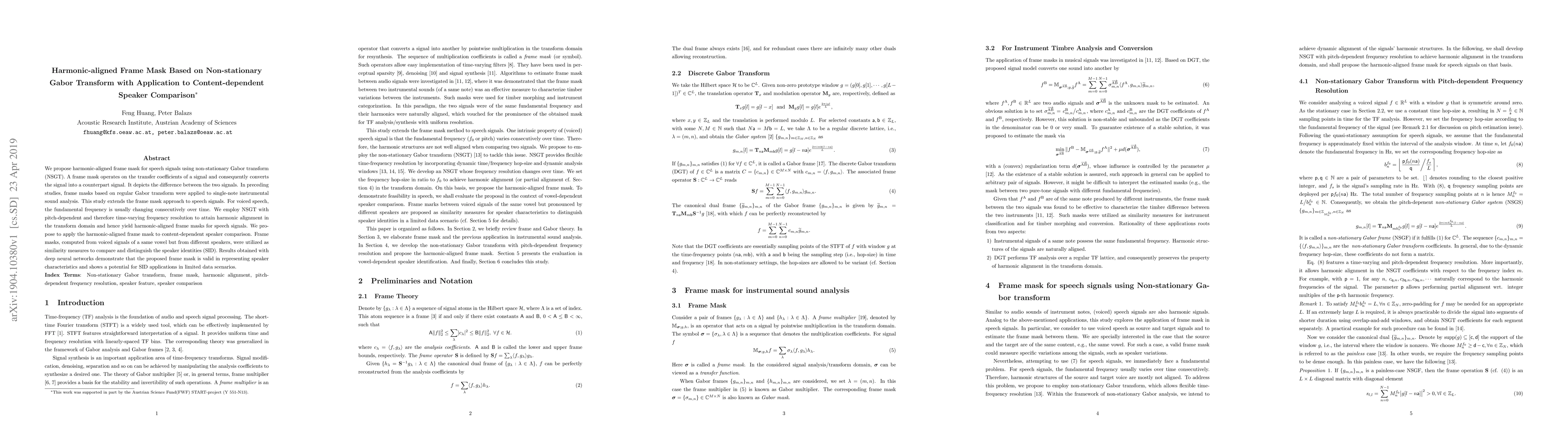 This paper proposes a harmonic-aligned frame mask for speech signals using a non-stationary Gabor transform, extending its application from single-note sounds to speech. The method aims to represent speaker characteristics for content-dependent speaker identification, showing potential in limited data scenarios.