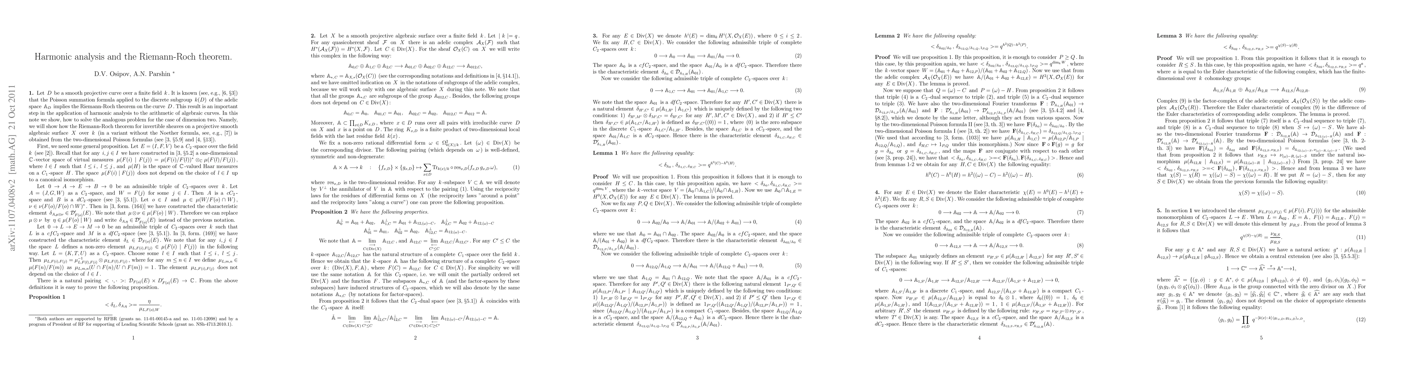 This paper extends previous work on harmonic analysis and utilizes two-dimensional Poisson formulas and adelic theory to derive the Riemann-Roch theorem for projective smooth algebraic surfaces over finite fields.