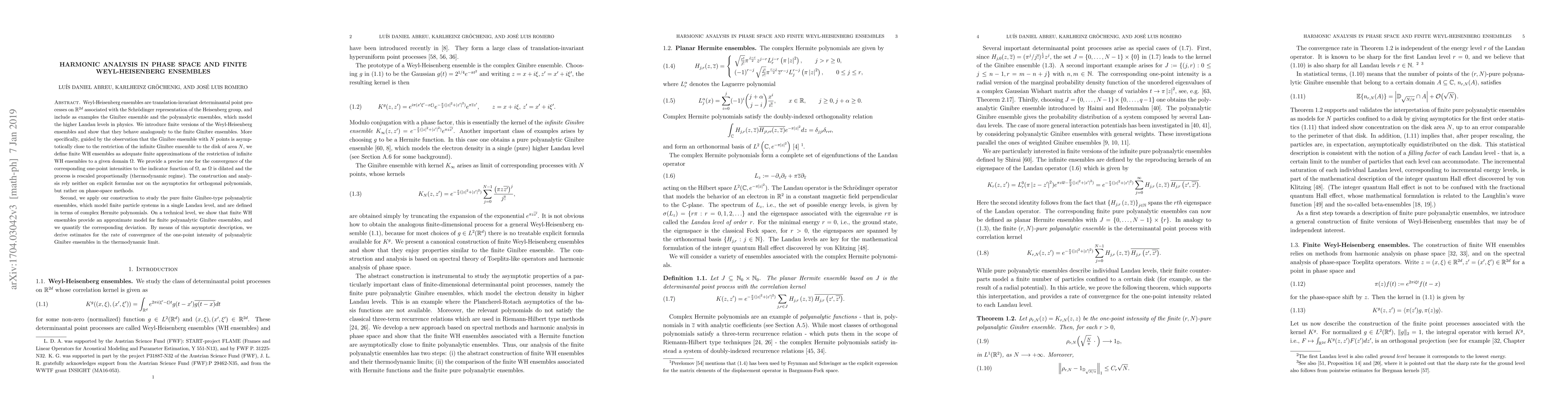 Weyl-Heisenberg ensembles are translation-invariant determinantal point processes on $\mathbb{R}^{2d}$ associated with the Schr\"odinger representation of the Heisenberg group, and include as examples the Ginibre ensemble and the polyanalytic ensembles, which model the higher Landau levels in physics. We introduce finite versions of the Weyl-Heisenberg ensembles and show that they behave analogously to the finite Ginibre ensembles. More specifically, guided by the observation that the Ginibre ensemble with $N$ points is asymptotically close to the restriction of the infinite Ginibre ensemble to the disk of area $N$, we define finite WH ensembles as adequate finite approximations of the restriction of infinite WH ensembles to a given domain $\Omega$. We provide a precise rate for the convergence of the corresponding one-point intensities to the indicator function of $\Omega$, as $\Omega$ is dilated and the process is rescaled proportionally (thermodynamic regime). The construction and analysis rely neither on explicit formulas nor on the asymptotics for orthogonal polynomials, but rather on phase-space methods. Second, we apply our construction to study the pure finite Ginibre-type polyanalytic ensembles, which model finite particle systems in a single Landau level, and are defined in terms of complex Hermite polynomials. On a technical level, we show that finite WH ensembles provide an approximate model for finite polyanalytic Ginibre ensembles, and we quantify the corresponding deviation. By means of this asymptotic description, we derive estimates for the rate of convergence of the one-point intensity of polyanalytic Ginibre ensembles in the thermodynamic limit.
