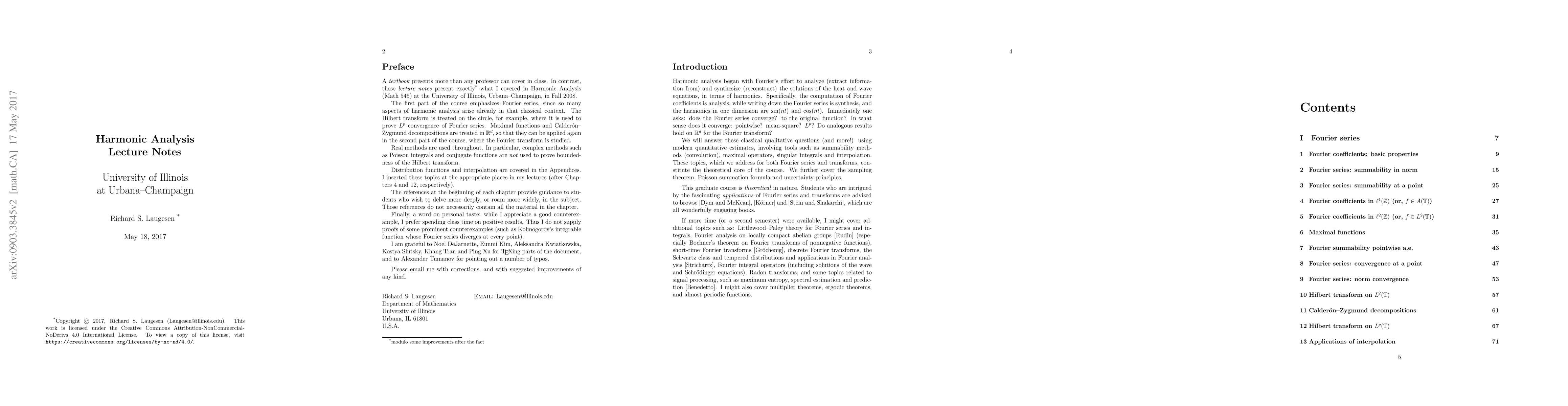 These lecture notes provide a comprehensive first graduate course in harmonic analysis, focusing on Fourier series, the Hilbert transform, maximal functions, and the Fourier transform, with appendices on distribution functions and interpolation. The course also covers advanced topics like band-limited functions, Poisson summation, and uncertainty principles.