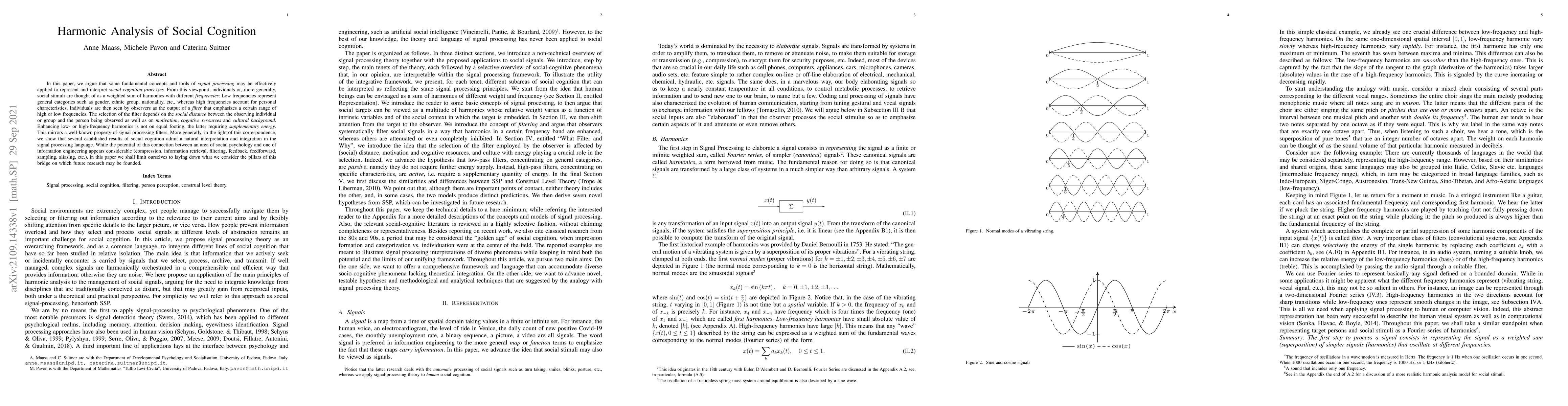 This paper proposes that signal processing concepts can represent social cognition, viewing social stimuli as harmonics with low frequencies for general categories and high frequencies for personal traits. It suggests that the interpretation of these stimuli depends on social distance, motivation, and cognitive resources, mirroring signal processing principles.