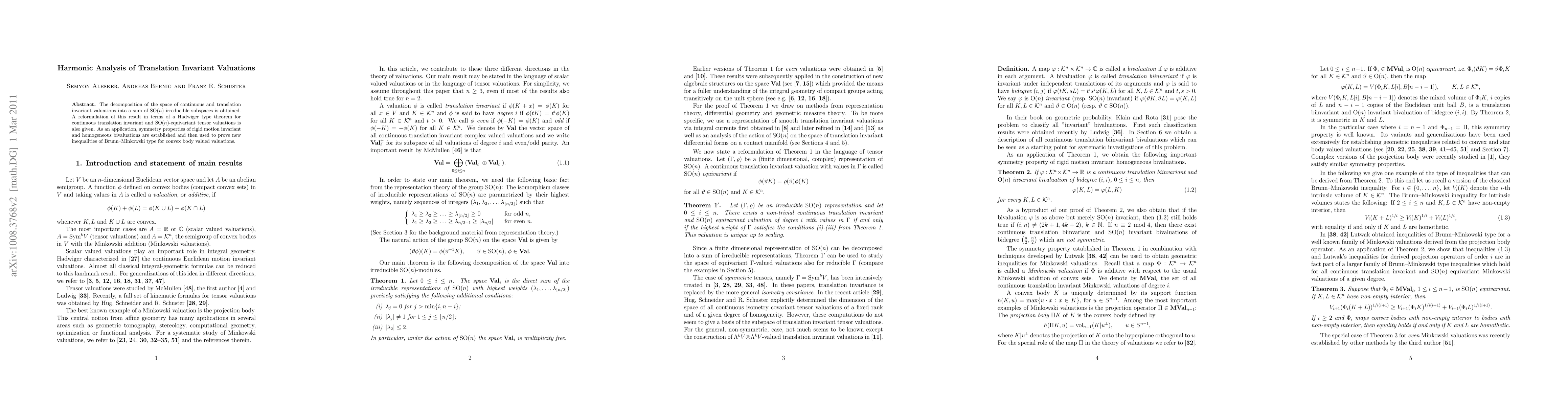 The decomposition of the space of continuous and translation invariant valuations into a sum of SO(n) irreducible subspaces is obtained. A reformulation of this result in terms of a Hadwiger type theorem for continuous translation invariant and SO(n)-equivariant tensor valuations is also given. As an application, symmetry properties of rigid motion invariant and homogeneous bivaluations are established and then used to prove new inequalities of Brunn-Minkowski type for convex body valued valuations.