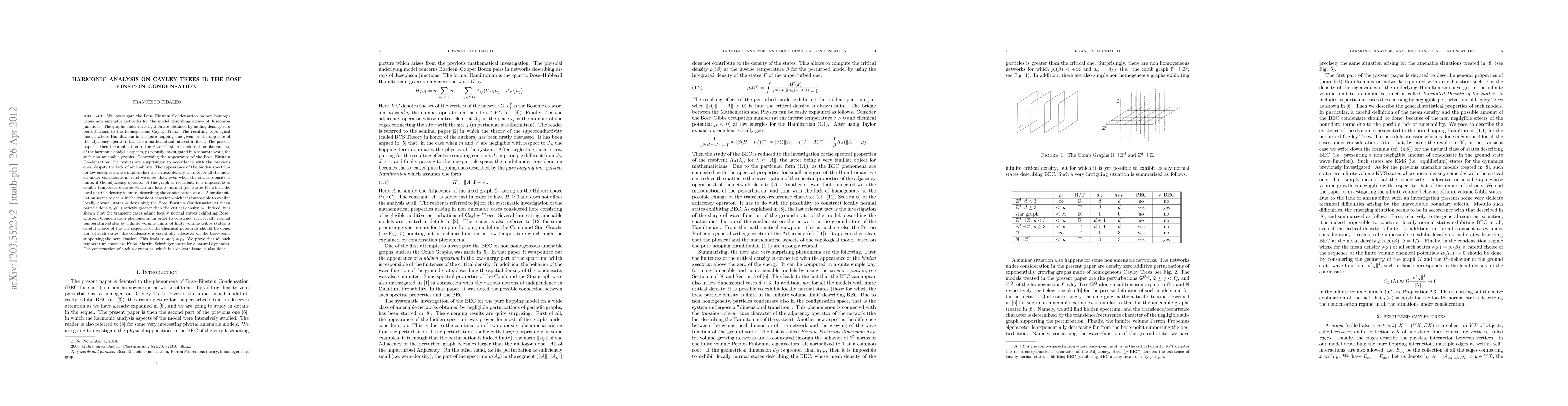 This paper explores Bose-Einstein condensation on non-homogeneous, non-amenable Cayley Trees, focusing on arrays of Josephson junctions. It applies harmonic analysis techniques to show that condensation cannot occur in recurrent or transient states unless the particle density matches the critical density. The study also constructs a natural dynamics for these states, revealing that the condensate is concentrated at the base-point of the perturbation.