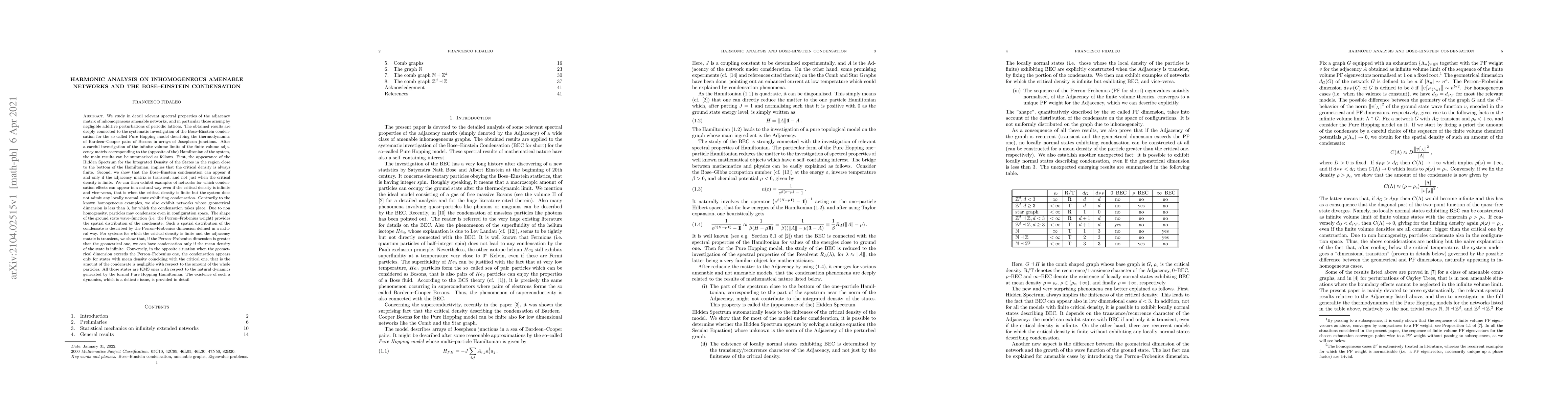 We study in detail relevant spectral properties of the adjacency matrix of inhomogeneous amenable networks, and in particular those arising by negligible additive perturbations of periodic lattices. The obtained results are deeply connected to the systematic investigation of the Bose--Einstein condensation for the so called Pure Hopping model describing the thermodynamics of Bardeen--Cooper pairs of Bosons in arrays of Josephson junctions.