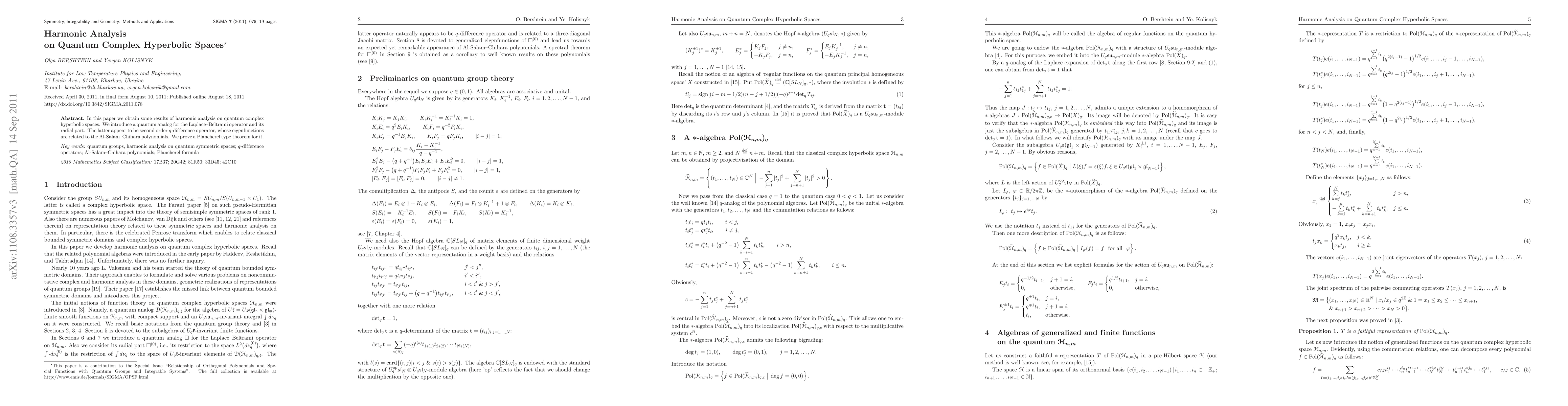 In this paper we obtain some results of harmonic analysis on quantum complex hyperbolic spaces. We introduce a quantum analog for the Laplace-Beltrami operator and its radial part. The latter appear to be second order $q$-difference operator, whose eigenfunctions are related to the Al-Salam-Chihara polynomials. We prove a Plancherel type theorem for it.