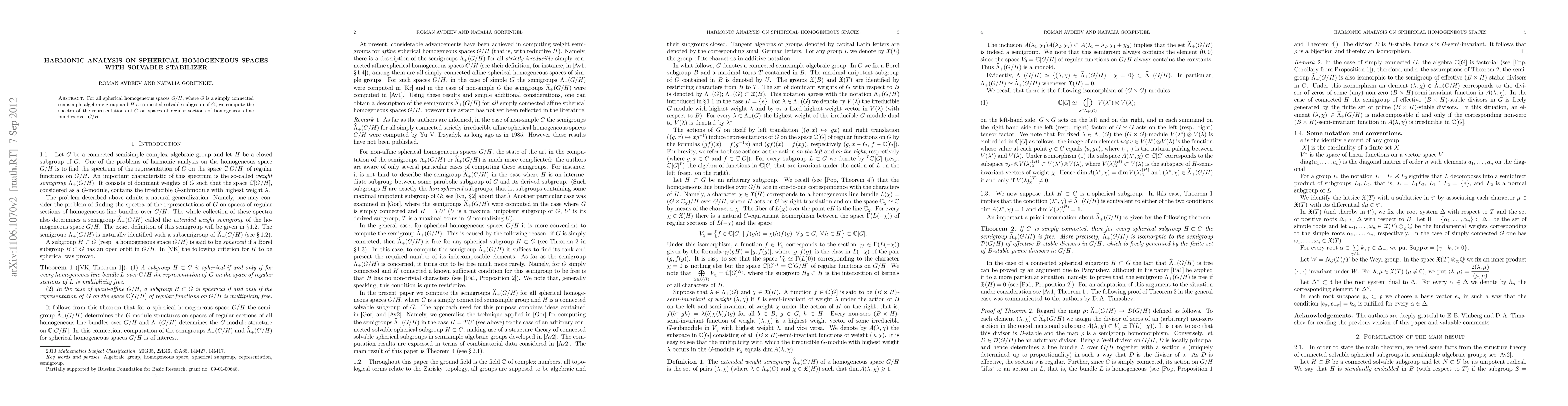 This paper computes the spectra of representations for G on spaces of regular sections of homogeneous line bundles over spherical homogeneous spaces G/H, where G is a simply connected semisimple algebraic group and H a connected solvable subgroup of G. The analysis leverages the solvability of the stabilizer to achieve these results.