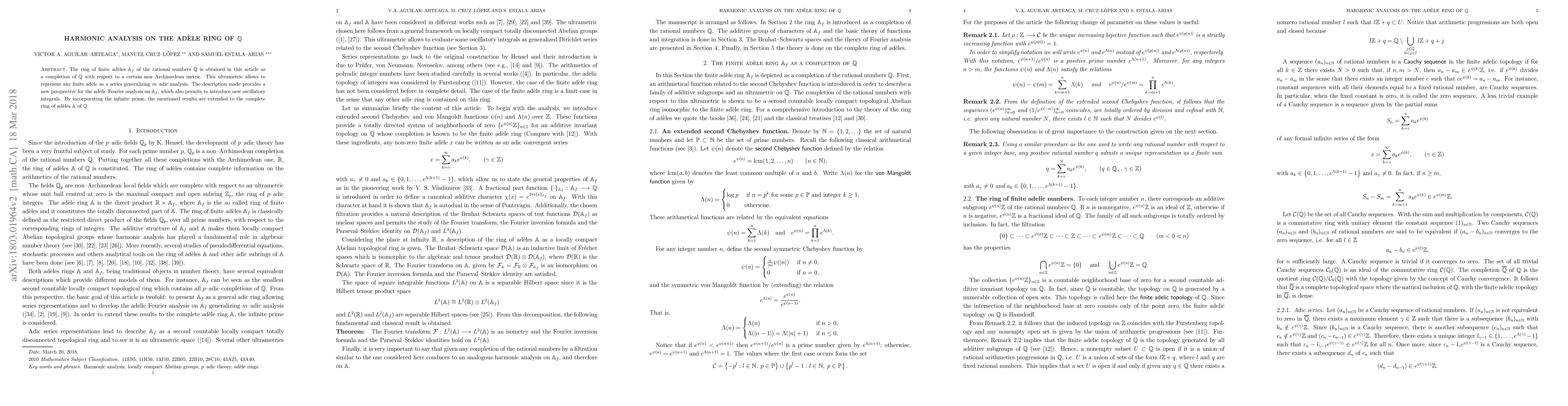 This paper explores a new perspective on adelic Fourier analysis using a non-Archimedean metric to complete the rational numbers with respect to an ultrametric, enabling the representation of finite ad extit{e}les as series and extension to the complete ring of ad extit{e}les.