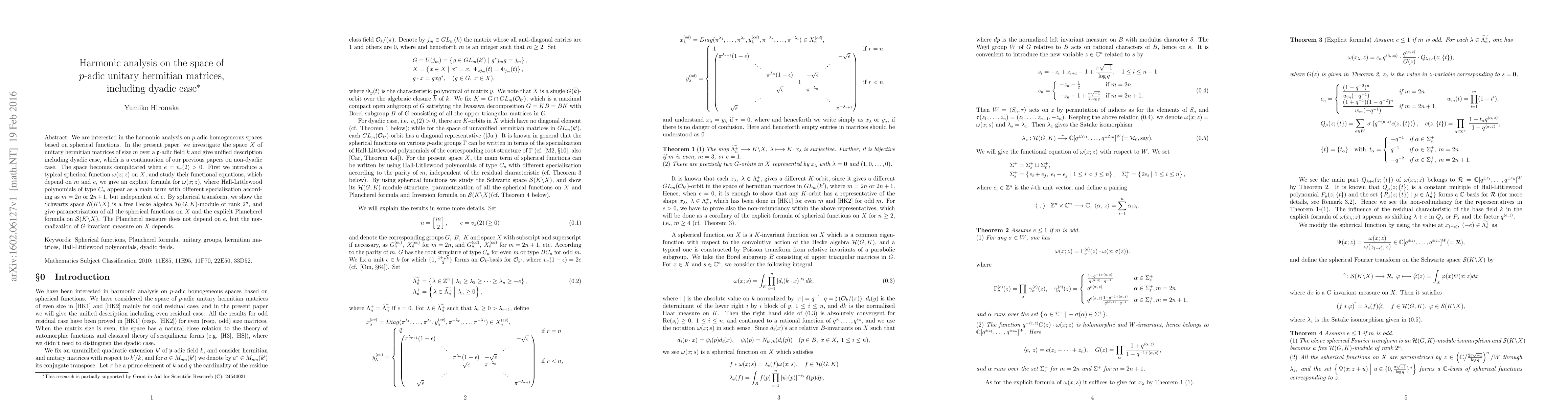 This paper explores harmonic analysis on the space of $p$-adic unitary hermitian matrices, presenting a unified description for the dyadic case. It introduces a typical spherical function and derives explicit formulas involving Hall-Littlewood polynomials, ultimately establishing a Plancherel formula and demonstrating that the Schwartz space forms a free Hecke algebra module.