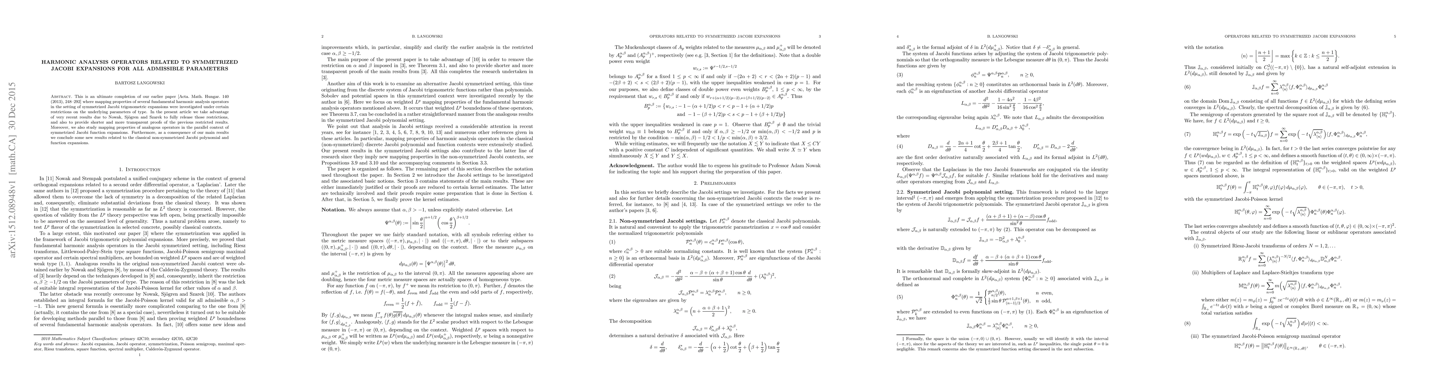This paper completes earlier work by fully removing restrictions on harmonic analysis operators in symmetrized Jacobi expansions, utilizing recent results to provide clearer proofs. It also extends findings to symmetrized Jacobi function expansions and yields new insights into classical Jacobi polynomial and function expansions.