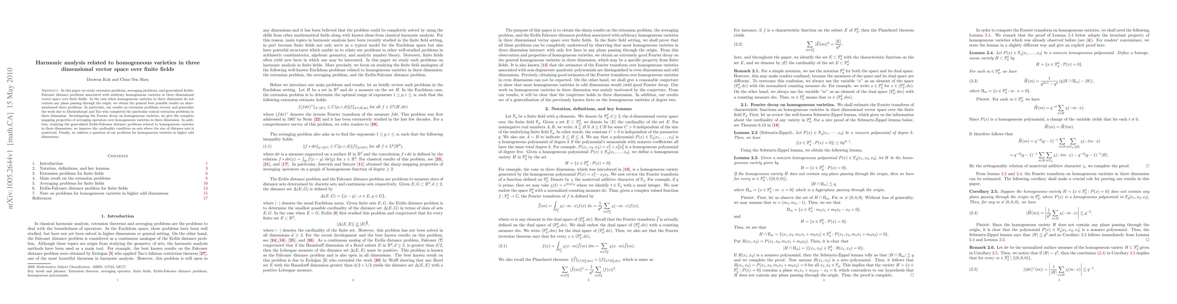 This paper investigates extension, averaging, and Erdős-Falconer distance problems for homogeneous varieties in three-dimensional vector spaces over finite fields, achieving optimal results when no plane passes through the origin. It generalizes previous work and provides complete mapping properties for averaging operators and improved cardinality conditions for distance sets.