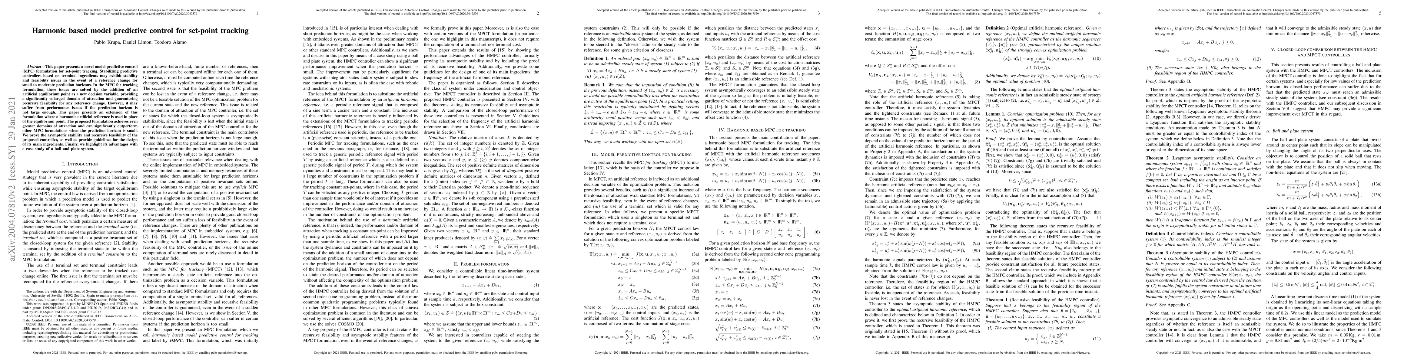 A novel model predictive control formulation is presented for set-point tracking, using a harmonic artificial reference to improve stability and performance with small prediction horizons.